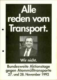 Titel/Autor: Alle reden vom Transport. Wir nicht. : Bundesweite Aktionstage gegen Atommülltransporte, 27. und 28. November 1992 Laufzeit: 1992-11-27 — 1992-11-28 Umfang: Flubblatt, DIN A4, zweiseitig, s/w Signatur: S-5-2-2