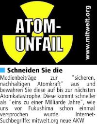 Schlagworte: Artikelsammlung, Atomenergie, Atomkraft, Atomkraftwerk, Atomkrieg, Atomlobby, Atommüll, Atomwaffen, Bauplatz, Beznau, Deutschland, Die Grünen, Endlagerung, Fessenheim, Freiburg/Breisgau, Fukushima, Klimaschutz, Laufzeitverlängerung, Radioaktivität, Russland, Schweiz, Stromversorgung, Tschernobyl, Ukraine, Umweltpolitik, Unfall, Widerstand, Wyhl