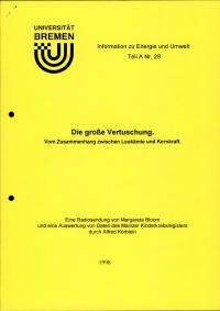 enthält: -Schriftverkehr, 10.9.1998-12.9.2000, u.a. Entwurf des Berichtes über Plutoniumbestimmungen in der Elbmarsch / Prof. Dr. Inge Schmitz-Feuerhake, 18.11.1998 -Entgegnung zur Stellungnahme der Physik-HL vom 12.1.99 zu meinem Bericht über Plutoniumbestimmungen in der Elbmarsch vom 20.11.98 / Prof. Dr. Inge Schmitz-Feuerhake, 10.4.1999 -Die große Vertuschung : Vom Zusammenhang zwischen Leukämie und Kernkraft : Eine Radiosendung von Margareta Bloom und eine Auswertung von Daten des Mainzer Kinderkrebsregisters durch Alfred Körblein / Prof. Dr. Inge Schmitz-Feuerhake (Redaktion), in: Information zu Energie und Umwelt, Teil A Nr. 29 / Universität Bremen, August 1998 (27 Seiten) (Digitalisat vorhanden) -Leukämie und Radioaktivitätsleckagen beim Kernkraftwerk Krümmel / Inge Schmitz -Feuerhake, Hayo Dieckmann, Bettina Dannheim, Anna Heimers, Heike Schröder, in: Information zu Energie und Umwelt, Teil A Nr. 28 / Universität Bremen, Juni 1997 (22 Seiten) (Digitalisat vorhanden) -Vortrags-Reader: Leukämie durch das Atomkraftwerk Krümmel : Was taugen die Entlastungsargumente? / IPPNW (Hrsg.), Oktober 1997 (56 Seiten) -Edelgasszenario - Bewertung kurzlebiger Spaltproduktemissionen des Kernkraftwerks Krümmel im Rahmen der Edelgasthese zur Aufklärung des Leukämievorkommens in der Elbmarsch. Beratungsauftrag v. 21.11.95 / Prof. Dr. Inge Schmitz-Feuerhake, 30.4.1996 -Broschüre: Leukämiemorbidität bei Kindern und Jugendlichen in der Umgebung des Kernkraftwerkes Würgassen / Matthias Demuth, Januar 1989 -Informationsdienst: Deutsches Ärzteblatt : Ärztliche Mitteilungen. Sonderdruck "Radioaktivität und Leukämie", Heft 27, 3.7.1998 - Gesellschaft für Strahlenschutz e.V.: -Flyer: 100 Jahre Röntgen : Medizinische Strahlenbelastung - Bewertung des Risikos: 2. Internationaler Kongreß/3. Jahrestagung, 28.4.-1.5.1995 -Programm: Neue Bewertung des Strahlenrisikos. 1. Internationale Konferenz, 28.2.-1.3.1992 -Abstractband: Neue Bewertung des Strahlenrisikos. 1. Internationale Konferenz, 28.2.-1.3.1992