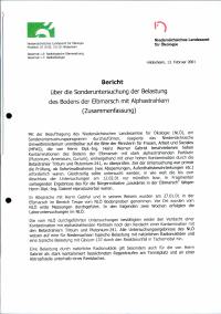 enthält u.a.: -Bericht über die Sonderuntersuchung der Belastung des Bodens der Elbmarsch mit Alphastrahlern / Niedersächsisches Landesamt für Ökologie (NLÖ), 13.2.2001 (46 Seiten) (Digitalisat vorhanden) -Bericht (SH/NS/ELB 2): Messungen der Radioaktivität in Elbmarsch und Elbgeest / Arbeitsgemeinschaft Physikalische Analytik und Meßtechnik (ARGE PhAM), 18.1.2001/10.2.2001 (Original mit Unterschriften) (19 Seiten) [siehe auch P-UH1-2-42] -Bericht (SH/NS/ELB 2): Messungen der Radioaktivität in Elbmarsch und Elbgeest : Zusammenfassung / Arbeitsgemeinschaft Physikalische Analytik und Meßtechnik (ARGE PhAM), 25.1.2001 (1 Seite) (Digitalisat vorhanden) -Leukämie in der Elbmarsch : Wege einer Aufklärung in der Kieler Hausstaubuntersuchung. Entwurf für Strahlentelex 3.11.00 / Dr. Helga Dieckmann, Prof. Dr. Inge Schmitz-Feuerhake, 26.10.[2000] (6 Seiten) -Bericht (SH/NS/ELB 2): Stellungnahme zu Messungen der Radioaktivität in der Elbmarsch / Arbeitsgemeinschaft Physikalische Analytik und Meßtechnik (ARGE PhAM), 17.11.2000 (23 Seiten) (Digitalisat vorhanden) -Urteil: Rechtsstreit des Landes Hessen (Beklagter und Berufungskläger) gegen Heinz Werner Gabriel (Kläger und Berufungsbeklagter) / Oberlandesgericht Frankfurt am Main, 3.7.2000 (Az. 9 U 139/99) -Aufsatz: Transurane in der Umgebung zweier Nuklearanlagen in der Elbmarsch - Widerlegung einer im GSF-Jahresbericht 1999 behaupteten Deutung als Kernwaffenfallout / Inge Schmitz-Feuerhake, 31.8.2000 (9 Seiten) (Digitalisat vorhanden) sowie Entwurf vom 25.8.2000 -Schriftverkehr, 19.12.1999-21.12.2000, u.a. Anschreiben Uwe Harden (MdL) an Ministerpräsidenten Sigmar Gabriel vom 4.12.2000 (Digitalisat vorhanden); Anschreiben Nieders. Ministerium für Frauen, Arbeit und Soziales an Nieders. Staatskanzlei vom 19.12.1999: Crud-Problem des KKW Krümmel -[Presse?]Mitteilung: ARGE PhAM, 16.10.2000: Aufklärung eines nuklearen Unfalls in Hanau : Atomgutachter gewinnen auch in zweiter Instanz (Digitalisat vorhanden) -Presseartikel: Plutonium auf dem Dachboden / Die ZEIT, 26.11.1998 bzw. Hannoversche Allgemeine, 23.11.1998 -Informationsdienst: Strahlentelex, Ausgabe Nr. 332-333, 2.11.2000