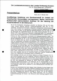 enthält: -Bericht: Norddeutsche Leukämie- und Lymphomstudie (NLL) : Ergebnisbericht. Kurzfassung / Wolfgang Hoffmann, Claudia Terschüren, Walter Schill, Hermann Pohlabeln, Eberhard Greiser, Bremer Institut für Präventionsforschung und Sozialmedizin (BIPS), April 2003 (18 Seiten) (Digitalisat vorhanden) -Artikel: Childhood malignancies around nuclear installations in the former GDR / M. Möhner, R. Stabenow, [ca. 1991] -Aufsatz: Strahlenwirkung - Strahlenrisiko / E. Lengfelder, 1988 (Seite 137-143) -Artikel: Strahlendosis im Kontext von Kernkraftwerken und Leukämie : Modellrechnung versus Realität am Beispiel des Kernkraftwerks Krümmel / Inge Schmitz-Feuerhake, in: umwelt-medizin-gesellschaft, Ausgabe Nr. 22, 1/2009 -Stellungnahme: Die radioaktive Wolke am 12. September 1986 : Widerlegung des Radonmärchens / S. Pflugbeil, I. Schmitz-Feuerhake, Stand 26.2.2007 (8 Seiten sowie 4 Seiten Anhang) [vergleiche P-UH1-2-37, Digitalisat vorhanden] -Stellungnahme: Zur Frage eines Brandes am 12. Sept. 86 auf dem GKSS-Gelände / Bürgerinitiative gegen Leukämie in der Elbmarsch e.V., Gesellschaft für Strahlenschutz e.V., Stand 21.2.2007 (8 Seiten) (Digitalisat vorhanden) -Dokumentation: Die Elbmarschleukämien - Stationen einer Aufklärung / Bürgerinitiative gegen Leukämie in der Elbmarsch e.V., Gesellschaft für Strahlenschutz e.V., IPPNW - Deutsche Sektion der Internationalen Ärzte für die Verhütung des Atomkrieges, Ärzte in sozialer Verantwortung e.V. (Hrsg.), Dezember 2006 (16 Seiten) (Digitalisat vorhanden) -Aufsatz: Das Elbmarsch-Leukämiecluster : Betrachtungen zum Dosiswirkungszusammenhang anhand der beobachteten Kontaminationen bei Geesthacht / Prof. Dr. Inge Schmitz-Feuerhake, Dipl. Ing. Heinz Werner Gabriel, Dr. Sebastian Pflugbeil, 13.11.2006 (überarbeitete Entwurfsfassung) (22 Seiten) (Digitalisat vorhanden) -Artikel: The Elbmarsch Leukemia Cluster: Are There Conceptual Limitations in Controlling Immission from Nuclear Establishments in Germany? / I. Schmitz-Feuerhake, H. Dieckmann, W. Hoffmann, E. Lengfelder, S. Pflugbeil, A.F. Stevenson, published online: 27.7.2005, in: Archives of Environmental Contamination and Toxicology (Website) [vergleiche: P-UH1-2-20] -Bericht: Die radioaktive Belastung der Nahumgebung der Geesthachter Atomanlagen durch Spaltprodukte und Kernbrennstoffe : Stand der Erkenntnis zur Ursachenaufklärung der in der Umgebung der kerntechnischen Anlagen bei Geesthacht aufgetretenen Leukämiehäufung / IPPNW Internationale Ärzte zur Verhütung des Atomkrieges e.V., Bürgerinitiative gegen Leukämie in der Elbmarsch. - Marschacht, 14.10.2002 (70 Seiten) (Digitalisat vorhanden) -Vermerk: Fortschreibung des Vermerks vom 03. September 2001 zu Kernbrennstoff-Mikroshären aus Bodenproben (siehe Anhang 4) / Dr. rer. nat. habil. A.F.G. Stevenson, 18.2.2002 -Antrag an die Leukämiekommission / Dr. Helga Dieckmann, Prof. Dr. Inge Schmitz-Feuerhake, 27.8.2001 (20 Seiten) -Artikel: Childhood Cancer in the Vicinity of German Nuclear Power Plants / Alfred Körblein, Wolfgang Hoffmann, in: Medicine & Global Survival, Vol. 6, No. 1, August 1999 -Anhang/Appendix B2: Immissionsrichtwerte der atomrechtlichen Bestimmungen / Prof. Dr. Inge Schmitz-Feuerhake, 10.8.1999, in: Strahlenbiologisches Gutachten / Dr. rer. nat. habil. Abraham F.G. Stevenson, April 2001 (digital vorhanden, nur zur Ansicht im Archiv) -Anhang/Appendix B3: Kritische Diskussion der Bevölkerungsschutzbestimmungen beim Betrieb von AKW in der Bundesrepublik / Prof. Dr. Inge Schmitz-Feuerhake, 26.3.1999, in: Strahlenbiologisches Gutachten / Dr. rer. nat. habil. Abraham F.G. Stevenson, April 2001 (digital vorhanden, nur zur Ansicht im Archiv) -Schriftverkehr, 21.2.1993-7.12.1994, u.a. Übergabe Fehlbildungen