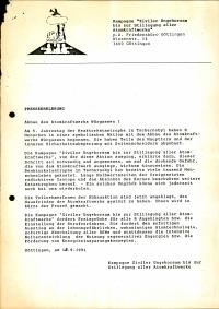 enthält u.a.: -Flugblätter, Flugschriften -Redebeitrag Sabine Morgenroth, 4.4.1993: Rückblick auf den Widerstand gegen den Standort Göttingen -Informationsdienste: Blätter zur Göttinger Geschichte / VVN-BdA, Nr. 1: Hiroshimaplatz, 1992; Informationen / Komitee für Grundrechte und Demokratie, Ausgabe 5/91, 25.10.1991 -Rundschreiben Friedensbüro Göttingen, 1991-1992 sowie weiterer Schriftverkehr -Artikel, Presseartikel, u.a.: Atomkraftwerk Würgassen erneut von AtomgegnerInnen blockiert / Reimar Paul, in: taz vom 22.5.1989 [Digitalisat vorhanden] -Berliner Appell gegen die Wehrpflicht -Blockade-Aktion AKW Würgassen, 1991: Strafsache gegen [Name1], Strafsache gegen [Name2], Unterlagen zum Straf-, Berufungs- und Revisionsverfahren Sabine Morgenroth, inkl. Presseartikel sowie Unterlagen der Akteneinsicht (u.a. Zeugenvernehmungen, Vermerke), Einlassung und Abschlussplädoyer Sabine Morgenroth, Februar 1992 (15 Seiten) [Digitalisate vorhanden] [siehe dazu auch S-1-45] -Presseerklärungen, u.a. zur Blockade-Aktion am AKW Würgassen, 1991 [Digitalisat vorhanden] -Kampagne "Ziviler Ungehorsam bis zur Stillegung aller Atomkraftwerke": Fragebogen, div. Rundschreiben (u.a.: Tschernobyl-Hilfe / Blockade AKW Würgassen, 9.9.1991 (2 Seiten) [Digitalisat vorhanden] [siehe dazu auch S-1-45] -Untersuchung der Häufigkeit von Krebserkrankungen im Kindesalter in der Umgebung westdeutscher kerntechnischer Anlagen 1980-90 / B. Keller, G. Haaf, P. Kaatsch, J. Michaelis. - Mainz, Februar 1992 (Kopie)