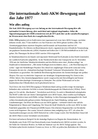 Enthält: -Die Internationale Anti-AKW-Bewegung und das Jahr 1977 / Dieter Kaufmann, 23.2.2017 (15 Seiten) [Digitalisat vorhanden]: Chronik der (internationalen) Bewegungsentstehung ab 1958 und Chronik der Geschehnisse 1977, veröffentlicht auf www.stoerfall-atomkraft.de: https://www.stoerfall-atomkraft.de/site/die-internationale-anti-akw-bewegung-und-das-jahr-1977 -Die weltweite Geschichte der Anti-AKW-Bewegung / Dieter Kaufmann, 6.4.2010 (7 Seiten) [Digitalisat vorhanden]: Artikel für die Gorleben Rundschau, Ausgabe 5, August 2010 (siehe auch unter https://www.bi-luechow-dannenberg.de/wp-content/uploads/2015/09/GR_2010_08_Web.pdf) -Die Anti-AKW-Bewegung kommt aus den USA, Frankreich und die frühen Anfänge in Westdeutschland ab 1955 / Dieter Kaufmann, 27.4.2023 (48 Seiten) [Digitalisat vorhanden]: Chronik anlässlich der Abschaltung der letzten Atomkraftwerke in Deutschland am 15.4.2023 -Kleines Anti-AKW-Lexikon / Dieter Kaufmann, Mai 2023 (52 Seiten) [Digitalisat vorhanden]: Abkürzungen, Erklärungen, Wissen, Stichwörter, Informationen -Wie die internationale Anti-AKW-Bewegung unbeabsichtigt die Unabhängigkeit und die Demokratiebewegung der Ukraine und Belarus beschleunigte / Dieter Kaufmann, 18.06.2024 (53 Seiten) [Digitalisat vorhanden] -Geschichte und Ursprung der Anti-Atom-Bewegung international und national : Eine vorläufigen Analyse / Dieter Kaufmann, 9.2.2013 [unveröffentlichtes Kapitel für das nicht erschienene Buch "Lieber heute aktiv als Morgen radioaktiv V"] (43 Seiten) [Digitalisat vorhanden]