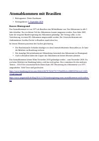 enthält: -Blogeintrag auf www.stoerfall-atomkraft.de: Atomabkommen mit Brasilien / Dieter Kaufmann, 5.9.2019 (Digitalisat vorhanden) -Chronik: Zeitliste Brasilien zu Atomkraftwerken 31.10.2022 / Dieter Kaufmann, 28.12.2022 (11 Seiten) (Digitalisat vorhanden)