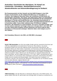 enthält: -Chronik: Australien: Geschichte der Aborigines, ihr Kampf um Landrechte, Uranabbau, Atombombenversuche, Atomkraftwerke und Atommüllendlagerung im Outback (1788-2023) / Dieter Kaufmann, 30.06.2023, inklusive Exkurs Uranabbau in Deutschland (105 Seiten) (Digitalisat vorhanden)