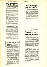 Enthält: -Presse zum Thema "Schraubensuche im Kernkraftwerk", 1986 -Presse und Niederschrift zum Schieber-Defekt 1986 -Presse, Niederschriften, Betreibermaterial, Schriftwechsel zum Störfall am 6.5.1987 -Unterlagen zur Feststellung von Berufskrankheiten von Mitarbeitern des AKW Gundremmingen (Herr Dr. Jänsch, Herr Wild), 1975 und 1987 -Umgebungsüberwachung KRB II : Betreibermeßprogramm (Anlage 1), Meßprogramm der unabhängigen Meßstellen (Behördenprogramm) (Anlage 2), 1985 -topographische Karte Gundremmingen und Umgebung, Maßstab 1:50.000 (DIN A4) -Siemens: Besprechungsnotiz Besprechung am 12.10.1983, TÜV, München mit Anlage Messungen mit TÜV-Abnahme (ohne Reaktorschutz) vom 19.10.1983 -Sulzer-Escher Wyss GmbH : technisches Datenblatt Kältesatz, 8.3.1978 -Kraftwerk Union: Liefer-Spezifikation für die Dieselmotoren der Diesel-Notstrom-Aggregate des Kernkraftwerkes KRB II - Gundremmingen, 20.5.1977 -Stromleitungsbau 110 kV-Doppelleitung von Gundremmingen nach Balzhausen: Stellungnahmen und Einwendung, Presse, Raumordnungsverfahren 1989
