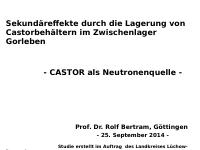 enthält u.a.: -Presseartikel -Fachartikel (Auszüge) -Informationsdienst: Strahlentelex Nr. 672-673 -Vortragsfolien, u.a.: Sekundäreffekte durch die Lagerung von Castorbehältern im Zwischenlager Gorleben : CASTOR als Neutronenquelle / Prof. Dr. Rolf Bertram, 25.9.2014 [nur als Digitalisat vorhanden] -Studie: Sekundäreffekte durch die Lagerung von Castorbehältern im Zwischenlager Gorleben : CASTOR als Neutronenquelle / Prof. Dr. Rolf Bertram, 25.9.2014, Studie erstellt im Auftrag des Landkreises Lüchow-Dannenberg (33 Seiten)