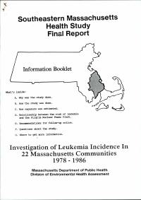 enthält: Investigation of Leukaemia Incidence In 22 Massachusetts Communities 1978-1986 -Anschreiben (1 Seite) -Southeastern Massachusetts Health Study : Final Report. Information Booklet / Massachusetts Department of Public Health, Division of Environmental Health Assessment, October 1990 (12 Seiten) (Digitalisat vorhanden) -Southeastern Massachusetts Health Study 1978-1986 / Martha Morris, Robert S. Knorr, Division of Environmental Health Assessment, [ohne Datum] (42 Seiten plus 206 Seiten Anhang) -A Review of the Southeastern Massachusetts Health Study / Daniel Hoffmann et al., October 1992 (37 Seiten) (Digitalisat vorhanden)