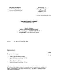 enthält: Deutscher Bundestag, 17. Wahlperiode, 1. Untersuchungsausschuss : Stenografische Protokolle: -Protokoll Nr. 31 vom 2.2.2011: 31. Sitzung des 1. Untersuchungsausschusses am 27.1.2011, Sitzungsteil Zeugenvernehmung [Vernehmung Name1 und Name2] (99 Seiten) -Protokoll Nr. 33 vom 22.3.2011: 33. Sitzung des 1. Untersuchungsausschusses am 10.2.2011, Sitzungsteil Zeugenvernehmung [Vernehmung Name3 und Name4] (82 Seiten) -Protokoll Nr. 35 vom 1.3.2011: 35. Sitzung des 1. Untersuchungsausschusses am 24.2.2011, Sitzungsteil Zeugenvernehmung [Vernehmung Name5 und Name6] (74 Seiten) -Protokoll Nr. 39 vom 30.3.2011: 39. Sitzung des 1. Untersuchungsausschusses am 24.3.2011, Sitzungsteil Zeugenvernehmung [Vernehmung Name7 und Name8] (159 Seiten) -Protokoll Nr. 41 vom 6.6.2011: 41. Sitzung des 1. Untersuchungsausschusses am 12.5.2011, Sitzungsteil Zeugenvernehmung [Vernehmung Name9 und Name10] (108 Seiten) -Protokoll Nr. 43 vom 5.7.2011: 43. Sitzung des 1. Untersuchungsausschusses am 26.5.2011, Sitzungsteil Zeugenvernehmung [Vernehmung Name11 und Name12] (217 Seiten) -Protokoll Nr. 44 vom 26.8.2011: 44. Sitzung des 1. Untersuchungsausschusses am 9.6.2011, Sitzungsteil Zeugenvernehmung [Vernehmung Name13] (49 Seiten) -Protokoll Nr. 46 vom 2.8.2011: 46. Sitzung des 1. Untersuchungsausschusses am 30.6.2011, Sitzungsteil Zeugenvernehmung [Vernehmung Name14] (93 Seiten) -Protokoll Nr. 51 vom 23.12.2011: 51. Sitzung des 1. Untersuchungsausschusses am 8.9.2011, Sitzungsteil Zeugenvernehmung [Vernehmung Name15] (173 Seiten) -Protokoll Nr. 54 vom 4.11.2011: 54. Sitzung des 1. Untersuchungsausschusses am 29.9.2011, Sitzungsteil Zeugenvernehmung [Vernehmung Name16] (30 Seiten) [Bericht des Untersuchungsausschusses, der auf die Protokolle Bezug nimmt, siehe unter P-US1-5-20-50-96]