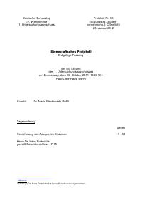 enthält: Deutscher Bundestag, 17. Wahlperiode, 1. Untersuchungsausschuss : Stenografische Protokolle: -Protokoll Nr. 56 vom 23.1.2012: 56. Sitzung des 1. Untersuchungsausschusses am 20.10.2011, Sitzungsteil Zeugenvernehmung [Vernehmung Name1] (59 Seiten) -Protokoll Nr. 58 vom 28.12.2011: 58. Sitzung des 1. Untersuchungsausschusses am 27.10.2011, Sitzungsteil Zeugenvernehmung [Vernehmung Name2, Name3 und Name4] (156 Seiten) -Protokoll Nr. 60 vom 28.12.2011: 60. Sitzung des 1. Untersuchungsausschusses am 10.11.2011, Sitzungsteil Zeugenvernehmung [Vernehmung Name5 und Name6] (110 Seiten) -Protokoll Nr. 62 vom 29.12.2011: 62. Sitzung des 1. Untersuchungsausschusses am 24.11.2011, Sitzungsteil Zeugenvernehmung [Vernehmung Name7 und Name8] (101 Seiten) -Protokoll Nr. 64 vom 10.1.2012: 64. Sitzung des 1. Untersuchungsausschusses am 1.12.2011, Sitzungsteil Zeugenvernehmung [Vernehmung Name9 und Name10] (99 Seiten) -Protokoll Nr. 66 vom 20.12.2011: 66. Sitzung des 1. Untersuchungsausschusses am 15.12.2011, Sitzungsteil Zeugenvernehmung [Vernehmung Name11 und Name12] (90 Seiten) -Protokoll Nr. 68 vom 7.2.2012: 68. Sitzung des 1. Untersuchungsausschusses am 19.1.2012, Sitzungsteil Zeugenvernehmung [Vernehmung Name13] (56 Seiten) -Protokoll Nr. 70 vom 22.2.2012: 70. Sitzung des 1. Untersuchungsausschusses am 26.1.2012, Sitzungsteil Zeugenvernehmung [Vernehmung Name14] (70 Seiten) -Protokoll Nr. 72 vom 15.3.2012: 72. Sitzung des 1. Untersuchungsausschusses am 9.2.2012, Sitzungsteil Zeugenvernehmung [Vernehmung Name15] (95 Seiten) -Protokoll Nr. 74 vom 19.3.2012: 74. Sitzung des 1. Untersuchungsausschusses am 1.3.2012, Sitzungsteil Zeugenvernehmung [Vernehmung Name16] (34 Seiten) [Bericht des Untersuchungsausschusses, der auf die Protokolle Bezug nimmt, siehe unter P-US1-5-20-50-96]