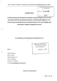 enthält: Stellungnahmen der deutschen Kritiker. Beiträge: -Behandlung einiger Probleme des Konzeptes und der grundsätzlichen sicherheitstechnischen Realisierbarkeit des beantragten Nuklearen Entsorgungszentrums bei Gorleben : Gutachterliche Stellungnahme / Dr. rer. nat. Dieter von Ehrenstein, 6.3.1979 (73 Seiten) -Radiologische Betrachtungen über die Auswirkungen des geplanten nuklearen Entsorgungszentrums bei Gorleben / Dr. Walter Herbst, [ohne Datum] (57 Seiten) -Kritische Betrachtung des DWK-Auslegungskonzepts zum Schutz gegen Druckwellen aus chemischen Explosionen / Dipl.-Ing. Georg Johannsohn, 18.1.1979 (35 Seiten plus 135 Seiten Anlagen A-C) -Probleme und Risiken bei der geplanten Einlagerung radioaktiver Abfälle in einen nordwestdeutschen Salzstock : Stellungnahme zum Konzept der Endlagerung radioaktiver Abfälle im Salz mit einer Wertung des der Niedersächsischen Landesregierung zur Entscheidung vorgelegten Antrages der DWK zur Endlagerung radioaktiver Abfälle im Salzstock Gorleben, Niedersachsen / Friedrich Mauthe, 31.1.1979 (47 Seiten) -Stellungnahme zur grundsätzlichen sicherheitstechnischen Realisierbarkeit eines Nuklearen Entsorgungszentrums bei Gorleben / Rüdiger Schäfer, Februar 1979 (41 Seiten) [Digitalisat der gesamten Broschüre im Original siehe P-HH1-5-3-22]