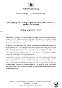 Titel/Autor: Eckpunktepapier zur Endlagerung Wärme entwickelnder radioaktiver Abfälle in Deutschland : "Endlagerung streitfrei stellen" / Ministerium für Umwelt, Klima und Energiewirtschaft Baden-Württemberg (UMBW), 2011