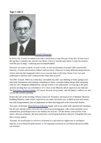 enthält: -Artikel: "Ich sag´ dem Schwein nicht, wann es stirbt" : SPIEGEL-Reporter Wilhelm Bittorf über das "Atomziel" Hattenbach und seine Bewohner / Wilhelm Bittorf, in: Der Spiegel, Ausgabe Nr. 9/1982 (2 Seiten) -Entwurf: "Atomziel" Hattenbach / Wolf-Dietrich Zeitz, [ohne Datum] (4 Seiten): nicht verwendetes Kapitel mit Abschrift des Spiegel-Artikels vom September 1982 -Reader: Fulda-Gap : Hier könnte der dritte Weltkrieg beginnen / Friedensbüro Osthessen, [ca. 1983] (44 Seiten) -Artikel: The greening of a nuclear strategist : How he learned to start worrying and hate the bomb / Roger Molander, in: Tribune/Today, 28.3.1982 (4 Seiten) -Songtext: My Country ´Tis of Thy People You´re Dying (Mein Land du gehst an deinem Volk zugrunde) / Buffy Sainte-Marie, [ohne Jahr], mit Übersetzung (4 Seiten) -Textauszug: Edward Bernays : Das Feature. Der Vater der Propaganda. Wie Edward Bernays Massen manipulierte / Manuel Gogos, gesendet im Deutschlandfunk, 11.2.2022 (24 Seiten) -Foto-Ausdruck: Informationsstand der HMI [Hahn-Meitner-Institut] Friedensgruppe vor der Urania aus Anlass der Feier des 25jährigen Gründungsjubiläums des Hahn-Meitner-Instituts. Rechts im Bild neben dem Poster: W.-D. Zeitz, [1984] [Digitalisat vorhanden] - Transkriptionen der Audioaufnahmen von Waleri Alexejewitsch Legassow: "Legasov-Tapes" / Yury Timofeyev, 2019-2021 [nur Digitalisate vorhanden, siehe auch unter https://legasovtapetranslation.blogspot.com/] [Audio-Aufnahmen siehe unter S-7-56]: -Tape 1, Side A, 16.08.2019 (13 Seiten) -Tape 1, Side B, 17.08.2019 (6 Seiten) -Tape 2, Side A, 21.08.2019 (11 Seiten) -Tape 2, Side B, 29.08.2019 (9 Seiten) -Tape 3, Side A, 01.10.2019 (11 Seiten) -Tape 3, Side B, 22.10.2019 (15 Seiten) -Tape 4, Side A, 08.11.2019 (9 Seiten) -Tape 4, Side B, 01.01.2020 (11 Seiten) -Tape 5, Side A, 21.01.2020 (15 Seiten) -Tape 5, Side B, 01.02.2020 (4 Seiten)
