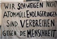 enthält: 2 Fotos von Transparenten für die Aktion "Das längste Anti-Atom-Transparent auf der Reichstagswiese zwischen Kanzleramt und Bundestag" von .ausgestrahlt in Berlin, 10.10.2009 [siehe dazu auch P-BK1-1] (Digitalisate vorhanden): -Text Foto S-1-40-1.1: "Wir schweigen nicht/Atom-Müll Endlagerungen sind Verbrechen gegen die Menschheit", -Text Foto S-1-40-1.2: "Hymne : Deutsche Kernkraft über alles/über alles in der Welt/wenn dem Strom-Geschäft zu nutze/Strahlung steil nach oben schnellt/von der Milz bis in die Leber/das Kind im Mutterleib befällt/deutsche Kernkraft über alles/über alles in der Welt"