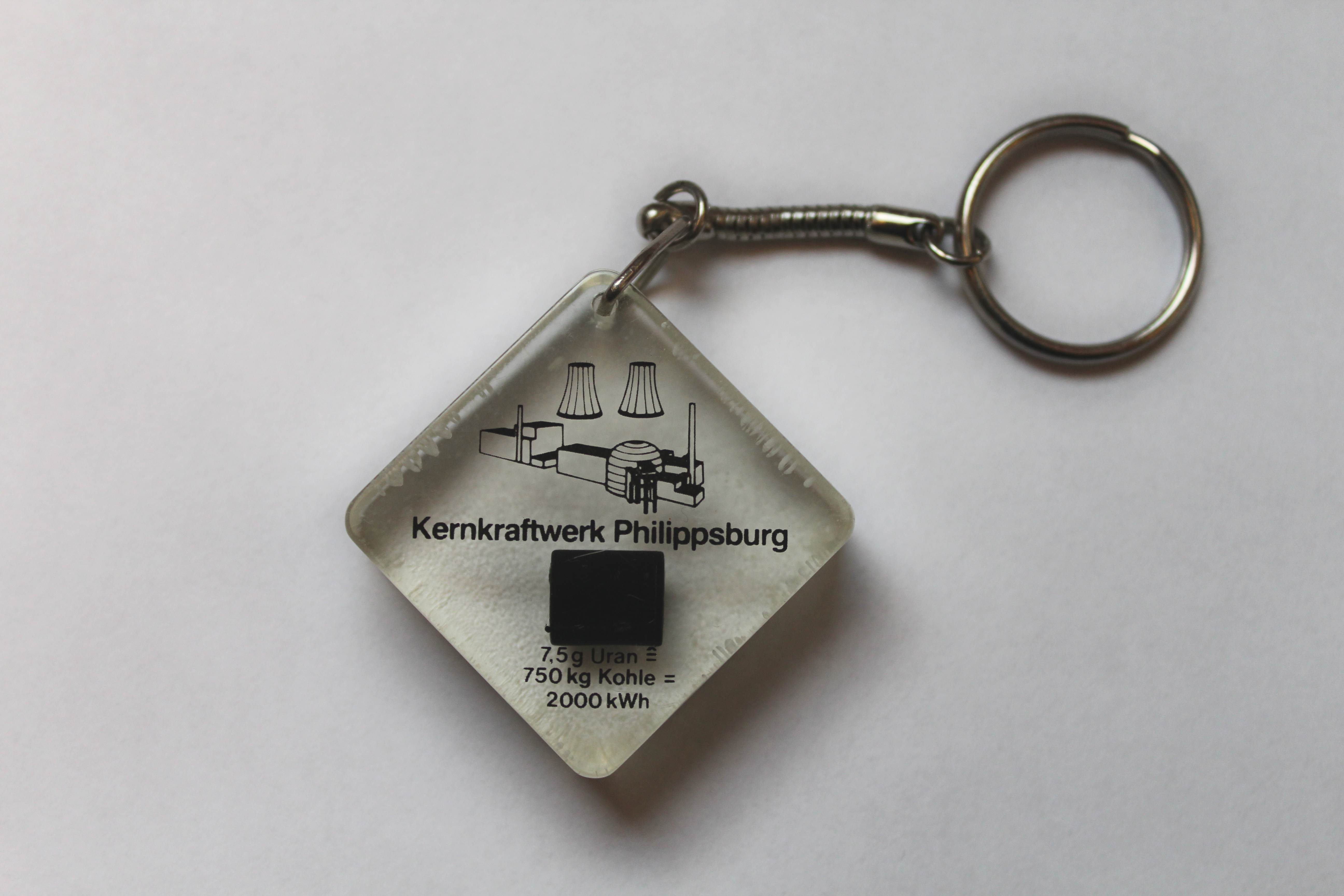 Signatur: S-8-16 Titel/Autor: Schlüsselanhänger: Werbegeschenk mit Uran-Pellet / KKW Philippsburg Laufzeit: unbekannt Umfang: Kunstharzblock, 3,5 x 3,5 x 1 cm mit Kette und Schlüsselring