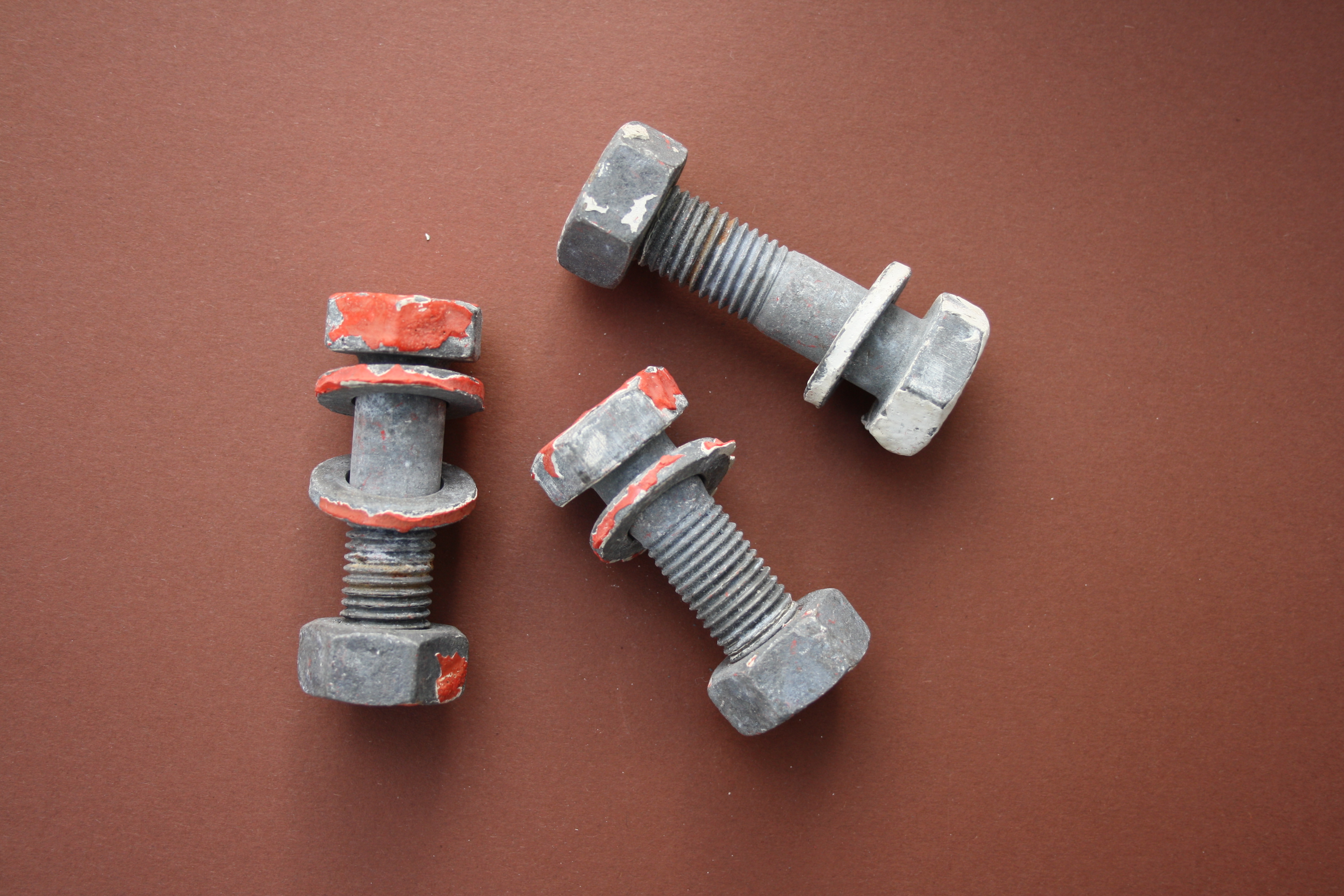 Signatur: S-8-20 Titel/Autor: Schrauben : Messmast Wyhler Wald / Badenwerk AG Laufzeit: unbekannt Umfang: 3 Maschinenschrauben mit Sechskantkopf, 4,7 cm x 1,8 cm, mit Muttern und Unterlegscheiben. Farbige Lackreste auf der Oberfläche [siehe dazu auch Fotos unter S-1-44]