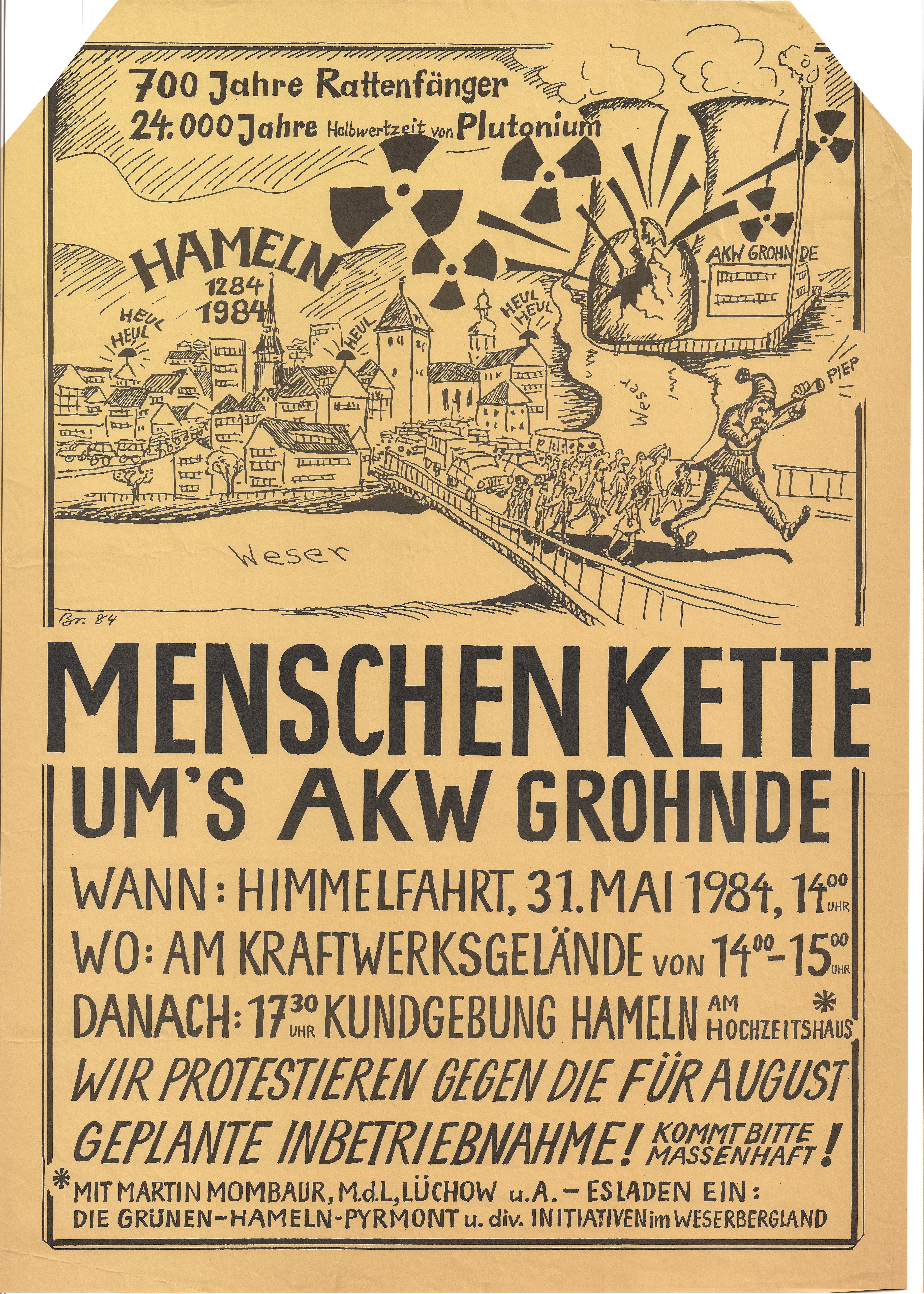 Text Plakat: "700 Jahre Rattenfänger 24.000 Jahre Halbwertzeit von Plutonium" "Wir protestieren gegen die für August geplante Inbetriebnahme! Kommt bitte massenhaft!" Informationen: "WANN: Himmelfahrt, 31. Mai 1984, 14 Uhr WO: am Kraftwerksgelände von 14-15 Uhr DANACH: 17:30 Uhr Kundgebung Hameln am Hochzeitshaus Mit Martin Mombaur, M.d.L, Lüchow u.A. - Es laden ein: DIE GRÜNEN Hameln-Pyrmont u. div. INITIATIVEN im Weserbergland"