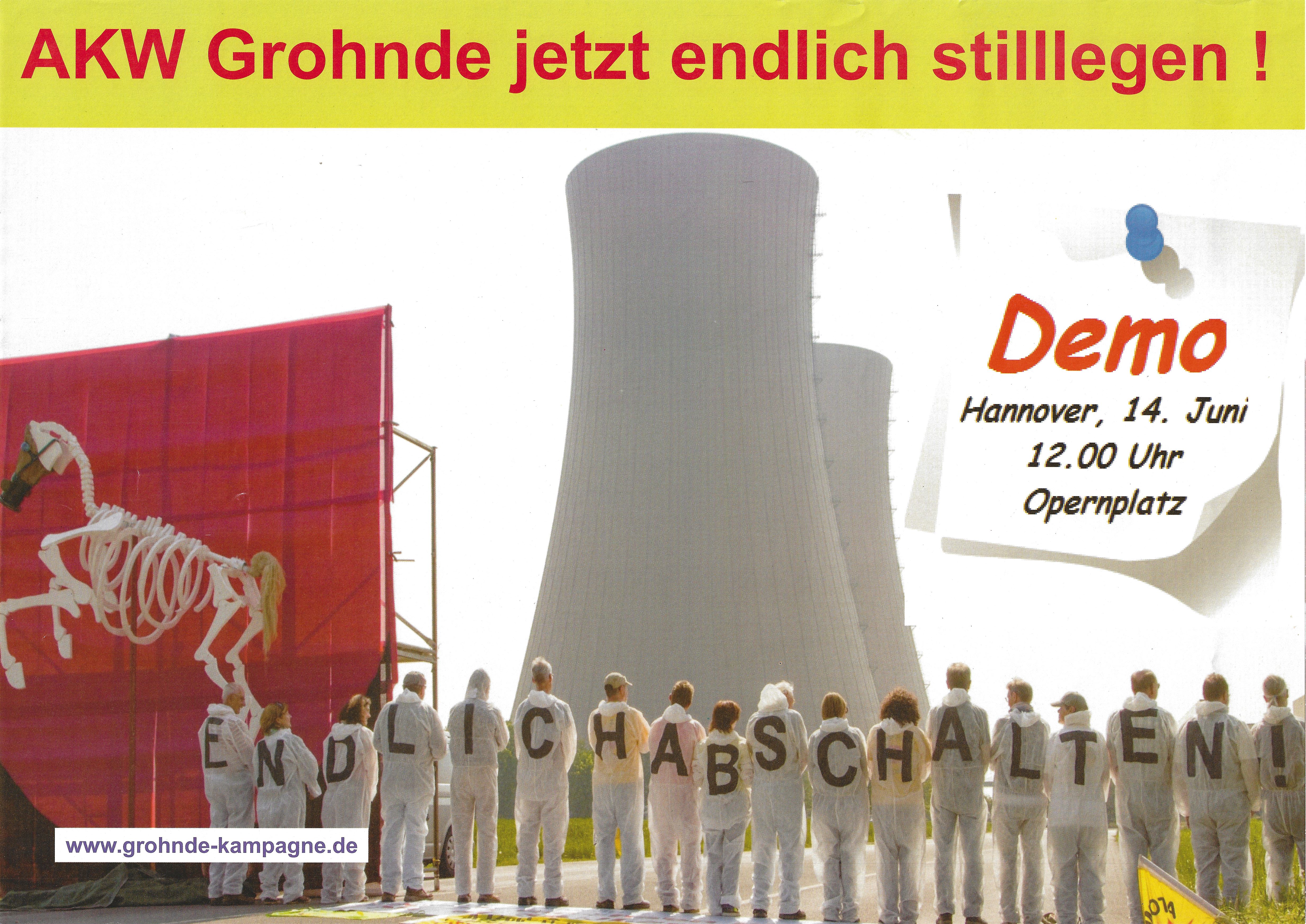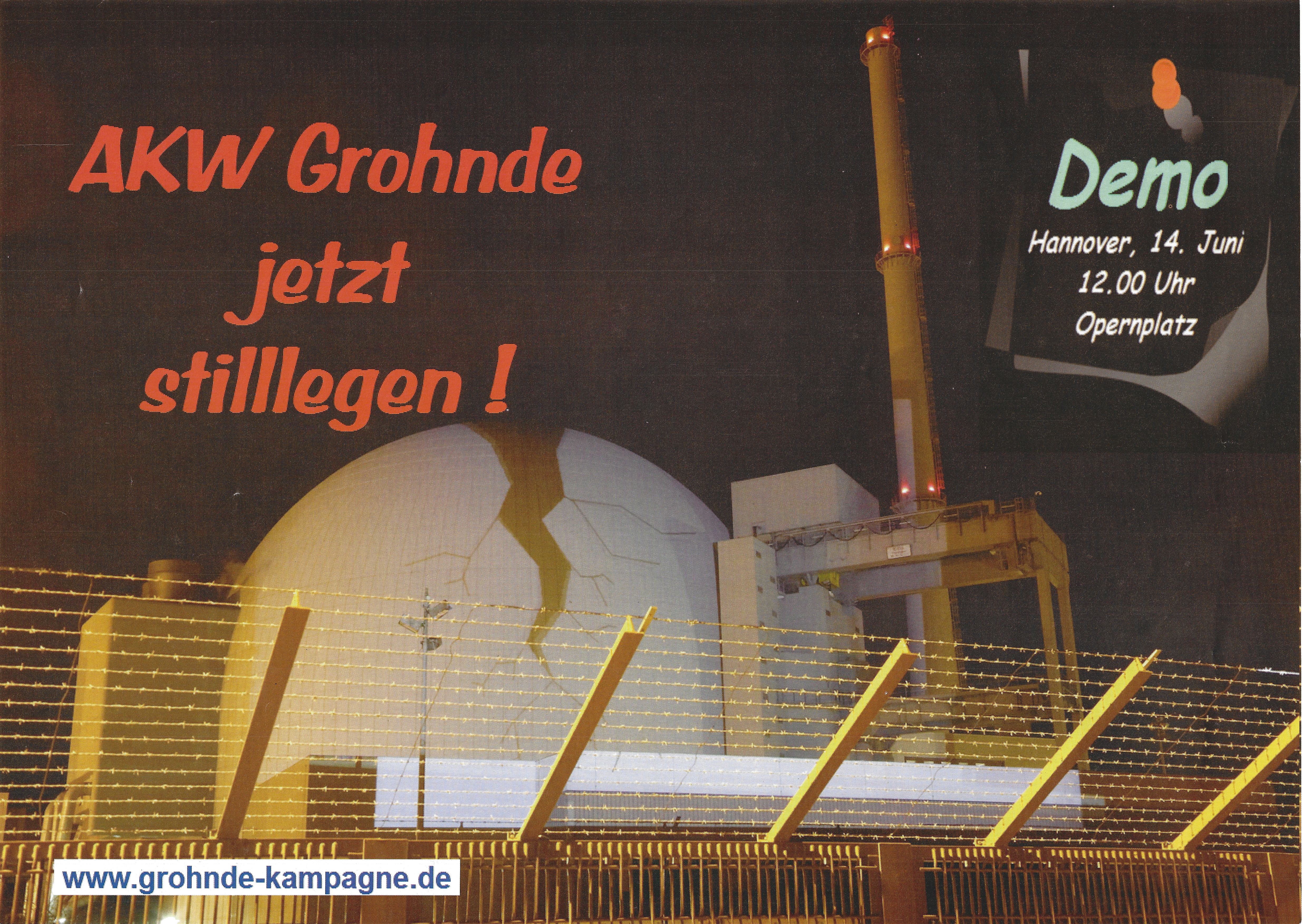 Signatur: S-2-106 Titel/Autor: AKW Grohnde jetzt stilllegen! : Demo Hannover, 14. Juni 12.00 Uhr Opernplatz Laufzeit: 2014-06-14 Umfang: Plakat DIN A3