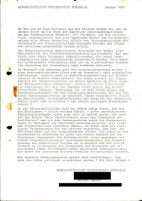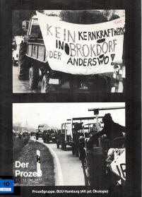 Enthält: -Flugschrift: Der Prozeß, 11.-12-Okt. 1977 / Prozeßgruppe gegen das AKW Brokdorf, BUU-Hamburg/Arbeitskreis politische Ökologie, 1977 (Digitalisat vorhanden) Inhalt: Gerichtsverhandlung über den Weiterbau des AKW-Brokdorf am 11. und 12. Oktober 1977 vor dem Oberverwaltungsgericht (OVL) Lüneburg über die Beschwerde von HEW, NWK, KWU und KKW Brokdorf GmbH gegen den Entscheid des Verwaltungsgerichtes Schleswig vom Februar 1977, das einen Baustop verfügt hatte. - Die Vorbereitung -Aufrufe und Erklärungen -Treckerdemonstration (Flyer der Aktionsgemeinschaft Bauern für Leben und Umwelt zur Treckerdemonstration am 10.10.1977, 8 Fotos) - Der Prozess -Die Forderung nach einem großen Verhandlungsraum -Aufstellung der verschiedenen Prozessbeteiligten und ihre Funktion -Katalog der Fragen, die im Prozess erörtert wurden -Prozessverlauf -Abschlussplädoyer von Prof. Fischerhof, Prozessbevollmächtigter von NWK, HEW und KKW Brokdorf GmbH -Abschlussplädoyers einiger Kläger - Das Urteil -Beschluss des OVG Lüneburg vom 17.10.1977 -Presseerklärung des Gerichts -"Spiegel"-Interview mit Ministerpräsident Stoltenberg über den Baustop in Brokdorf - Bilanz
