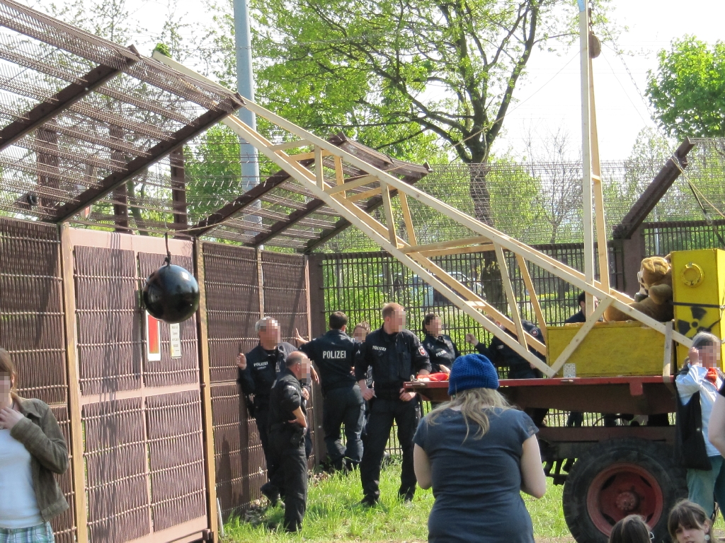 Signatur: S-1-36-11 Titel/Autor: Aktion am Zaun mit „Abrisskugel“, 25.04.2011, AKW Grohnde Laufzeit: 2011-04-25 Umfang: 1 digitales Foto, farbig,