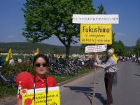 Signatur: S-1-34-6 Titel/Autor: Demonstration Günzburg, 25.04.2011, AKW Gundremmingen Laufzeit: 2011-04-25 Umfang: 1 digitales Foto, farbig, Mit selbstgestalteten Transparent "Fukushima grüßt Tschernobyl zum 25 ..."
