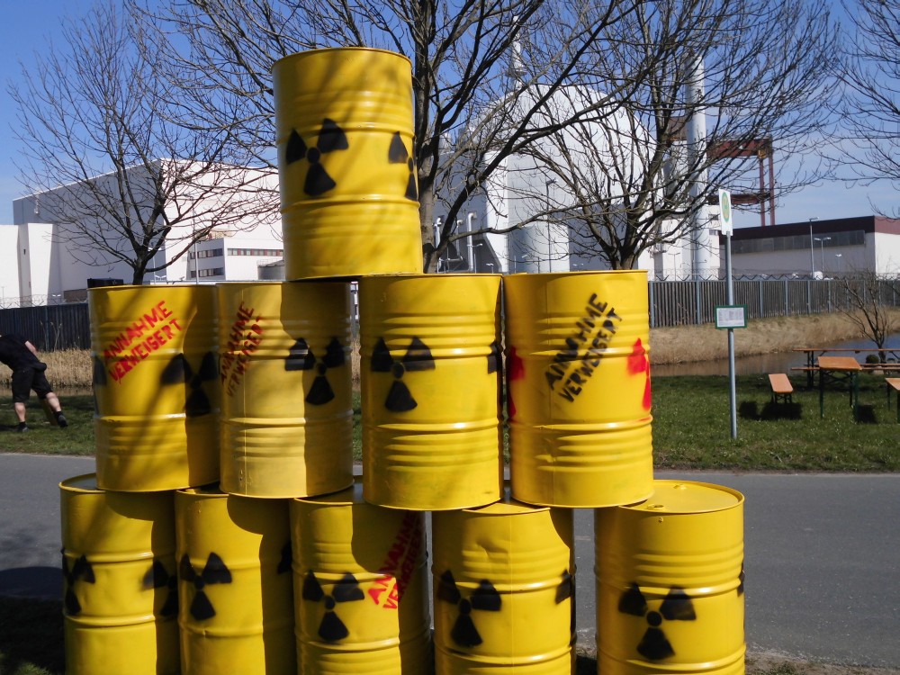 Signatur: S-1-35-3 Titel/Autor: Demonstration, Mai 2013, AKW Brokdorf Laufzeit: 2013-05 Umfang: 1 digitales Foto, farbig, Atommüllfässer-Turm vor dem AKW Brokdorf