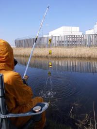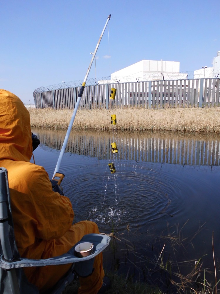 Signatur: S-1-35-4 Titel/Autor: Demonstration, Mai 2013, AKW Brokdorf Laufzeit: 2013-05 Umfang: 1 digitales Foto, farbig, Atommüllfässchen-Angeln vor dem AKW Brokdorf