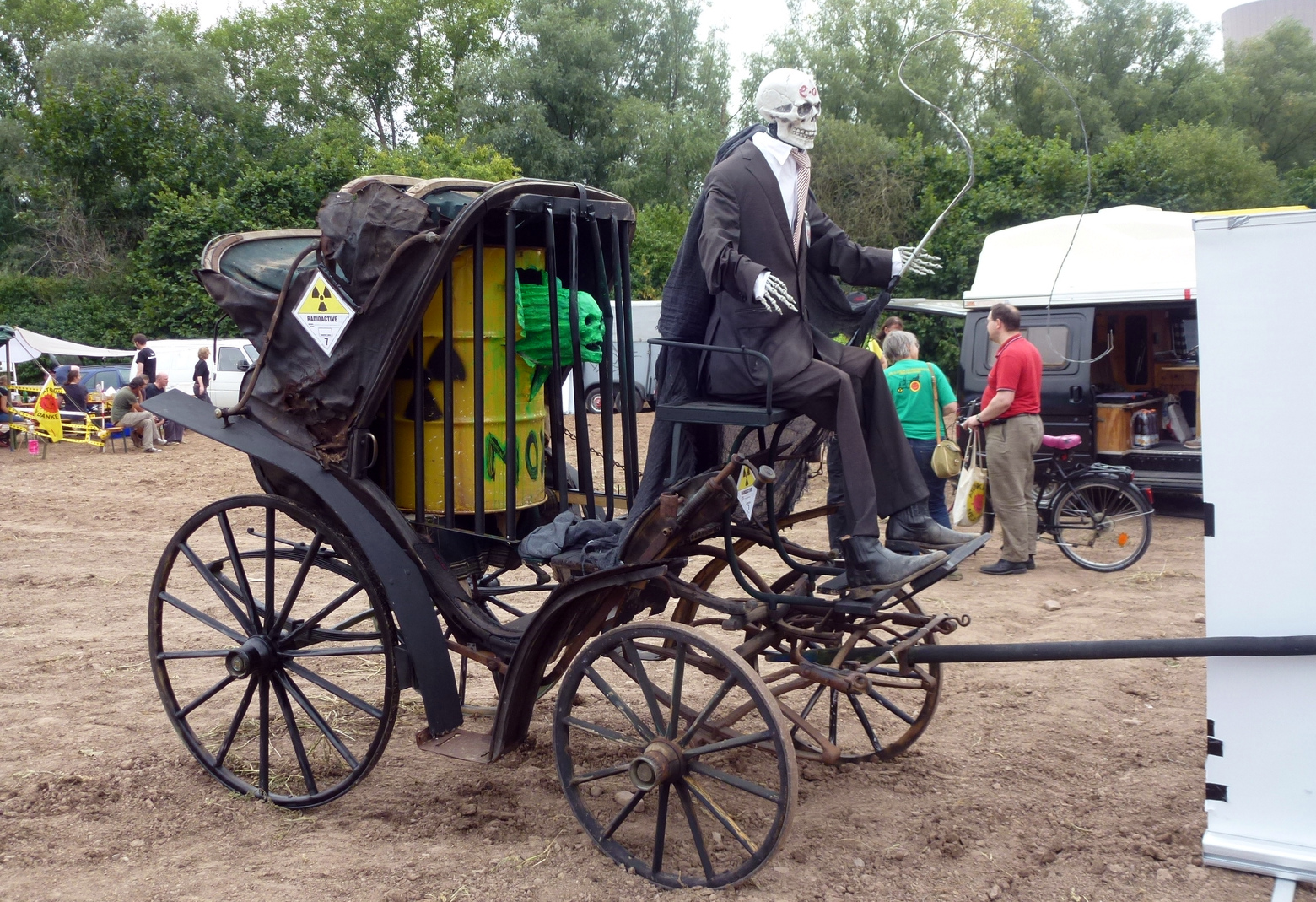 Signatur: S-1-37-3 Titel/Autor: Kutsche, Atommüllfass, Skelett im Anzug, Kundgebungsgelände AKW Grohnde Laufzeit: 2013-09-07 Umfang: 1 digitales Foto, farbig,