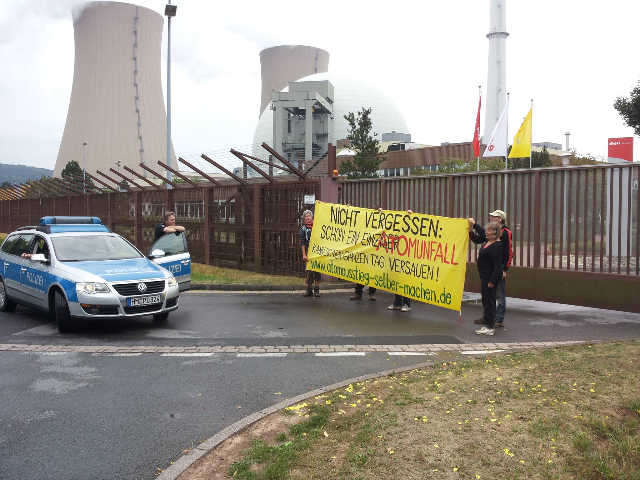 Signatur: S-1-37-6 Titel/Autor: Transparentaktion am Tor des AKW Grohnde Laufzeit: 2013-09-07 Umfang: 1 digitales Foto, farbig, Aufschrift Transparent: "Nicht vergessen: ein einziger Atomunfall kann dir den ganzen Tag versauen!"