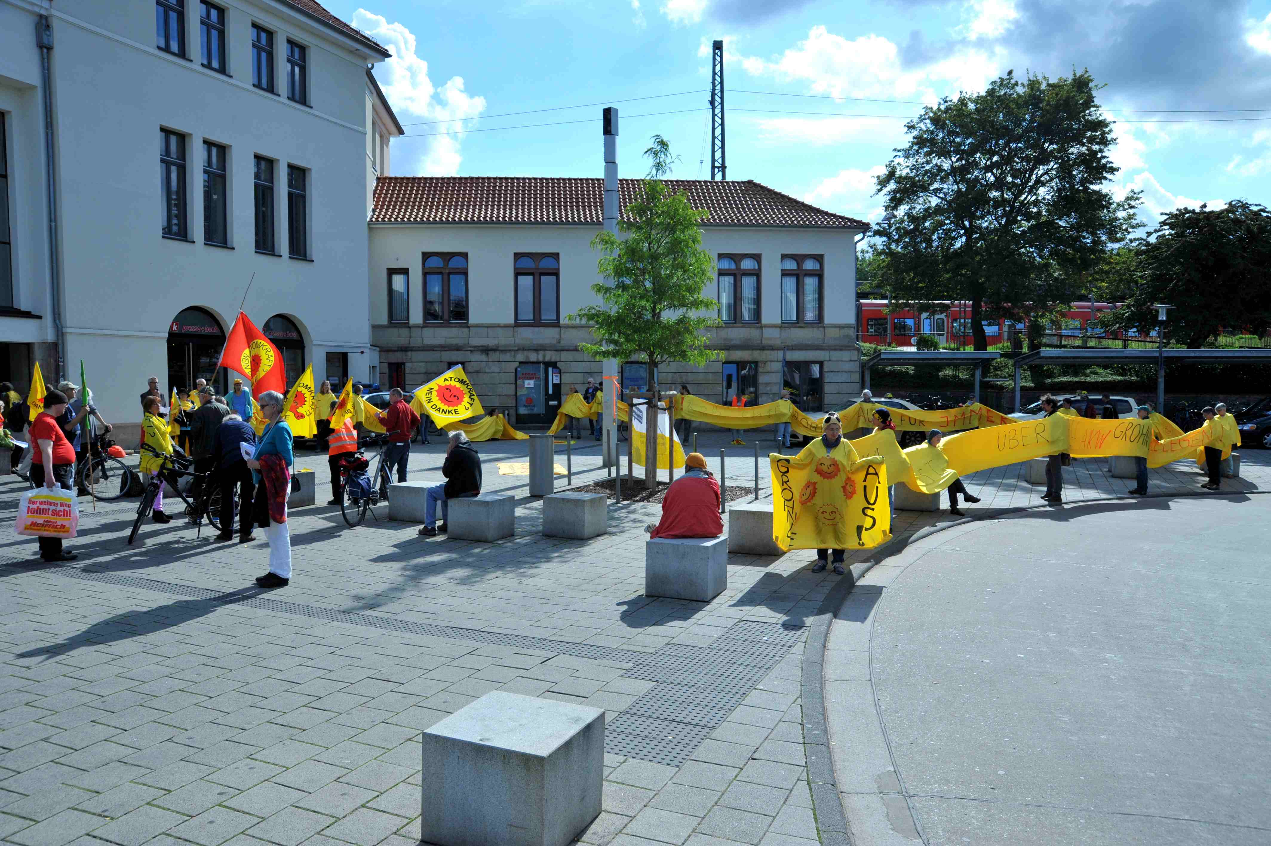Signatur: S-1-30-6 Titel/Autor: Demonstration Bahnhof Emmerthal, AKW Grohnde Laufzeit: 2011-10-02 — 2011-10-03 Umfang: 1 Foto, digital, farbig,