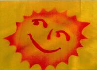 -Vorderseite: lachende rote Anti-Atom-Sonne auf gelbem Hintergrund