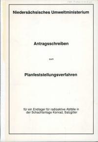 Titel/Autor: Antragsschreiben zum Planfeststellungsverfahren für ein Endlager für radioaktive Abfälle in der Schachtanlage Konrad Salzgitter / Niedersächsisches Umweltministerium. - Braunschweig Laufzeit: 1982-08-31 — 1990-03-20 Umfang: Broschüre, 7 Seiten Signatur: P-ASK-5-1-2-61