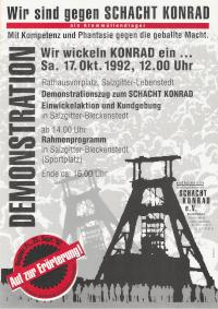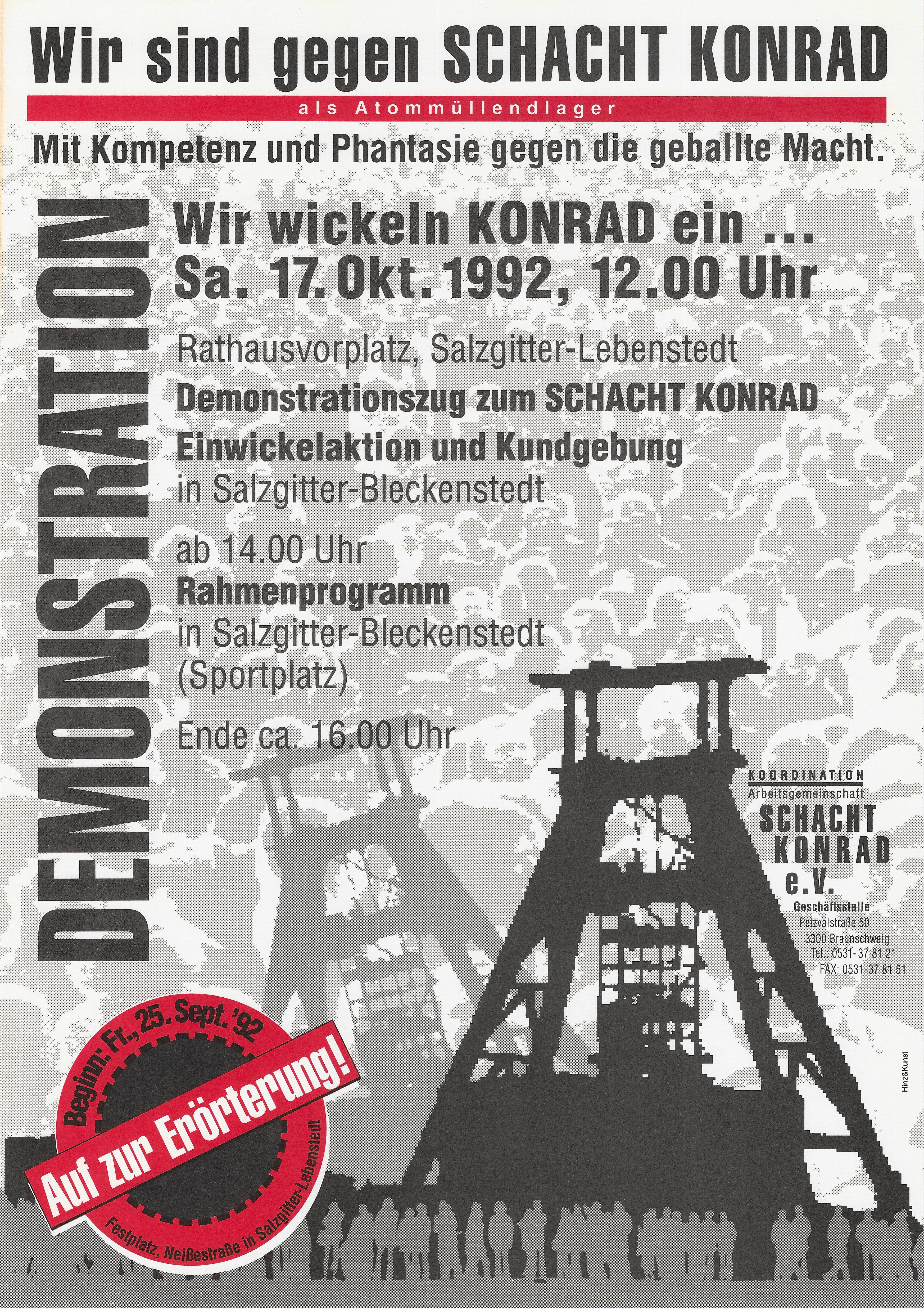 Titel/Autor: Auf zur Erörterung! : Demonstration "Wir sind gegen Schacht KONRAD", 17. Okt. 1992, Salzgitter Laufzeit: 1992 Umfang: 1 Plakat DIN A3 Signatur: S-2-18