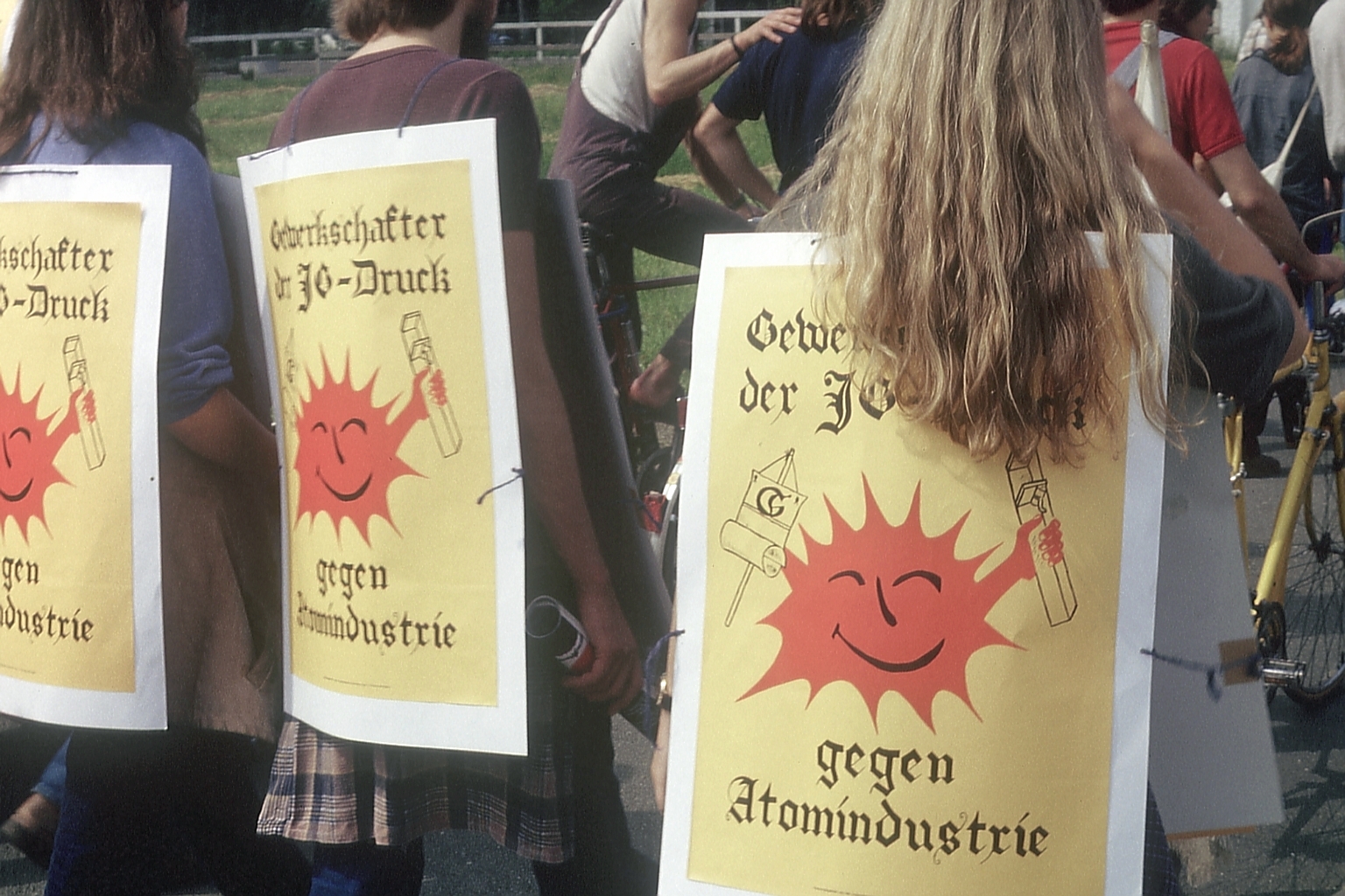 Titel/Autor: Holzturm-Demonstration gegen Schacht Konrad : Plakatträger:innen der IG-Druck, 27.6.1981 Laufzeit: 1981-06-27 Umfang: 1 Foto, digital Signatur: S-1-24-1-12