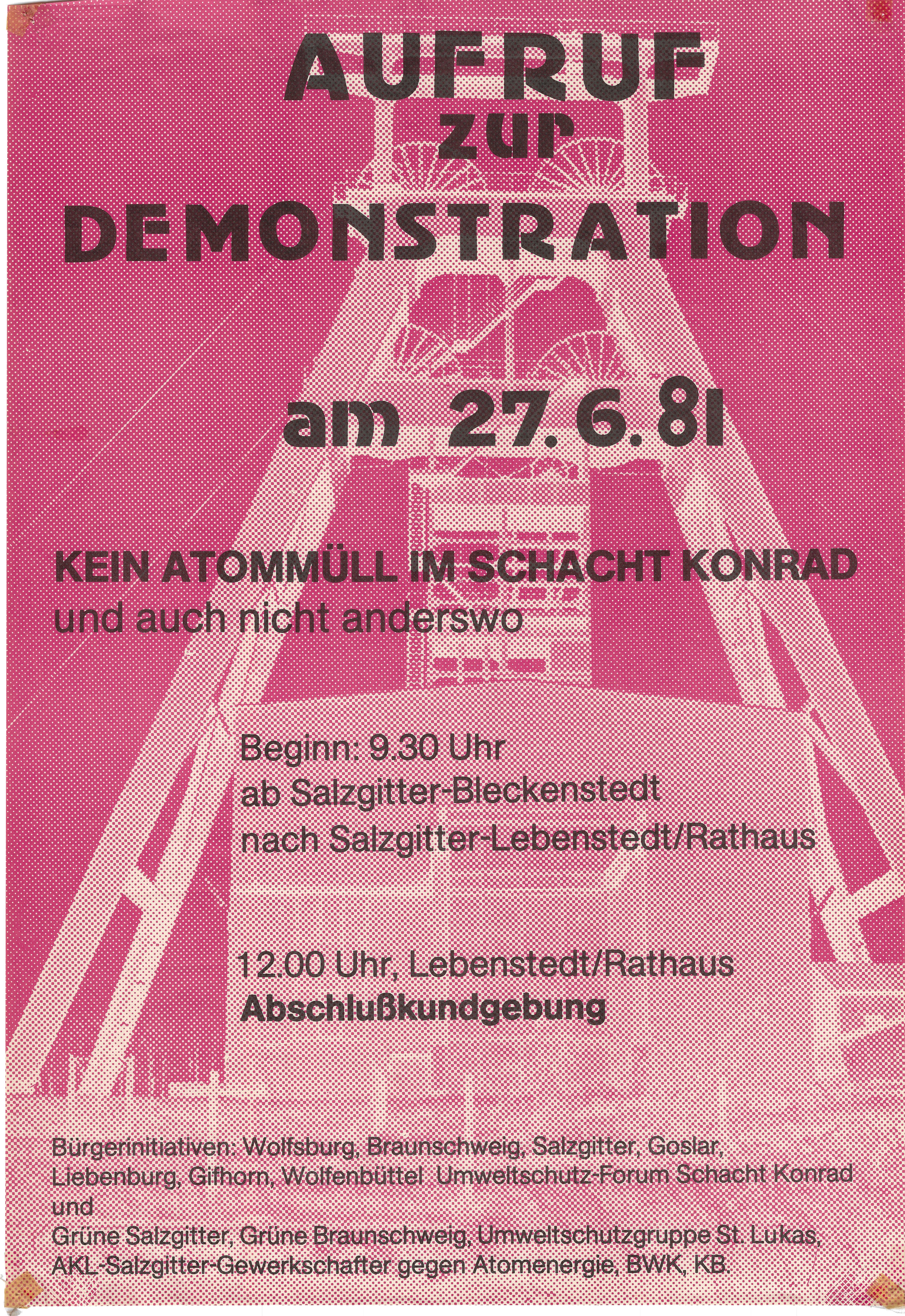 Titel/Autor: Aufruf zur Demonstration : Kein Atommüll in Schacht KONRAD und auch nicht anderswo, 27.6.81, Salzgitter-Bleckenstedt Laufzeit: 1981 Umfang: 1 Plakat DIN A2 Signatur: S-2-40