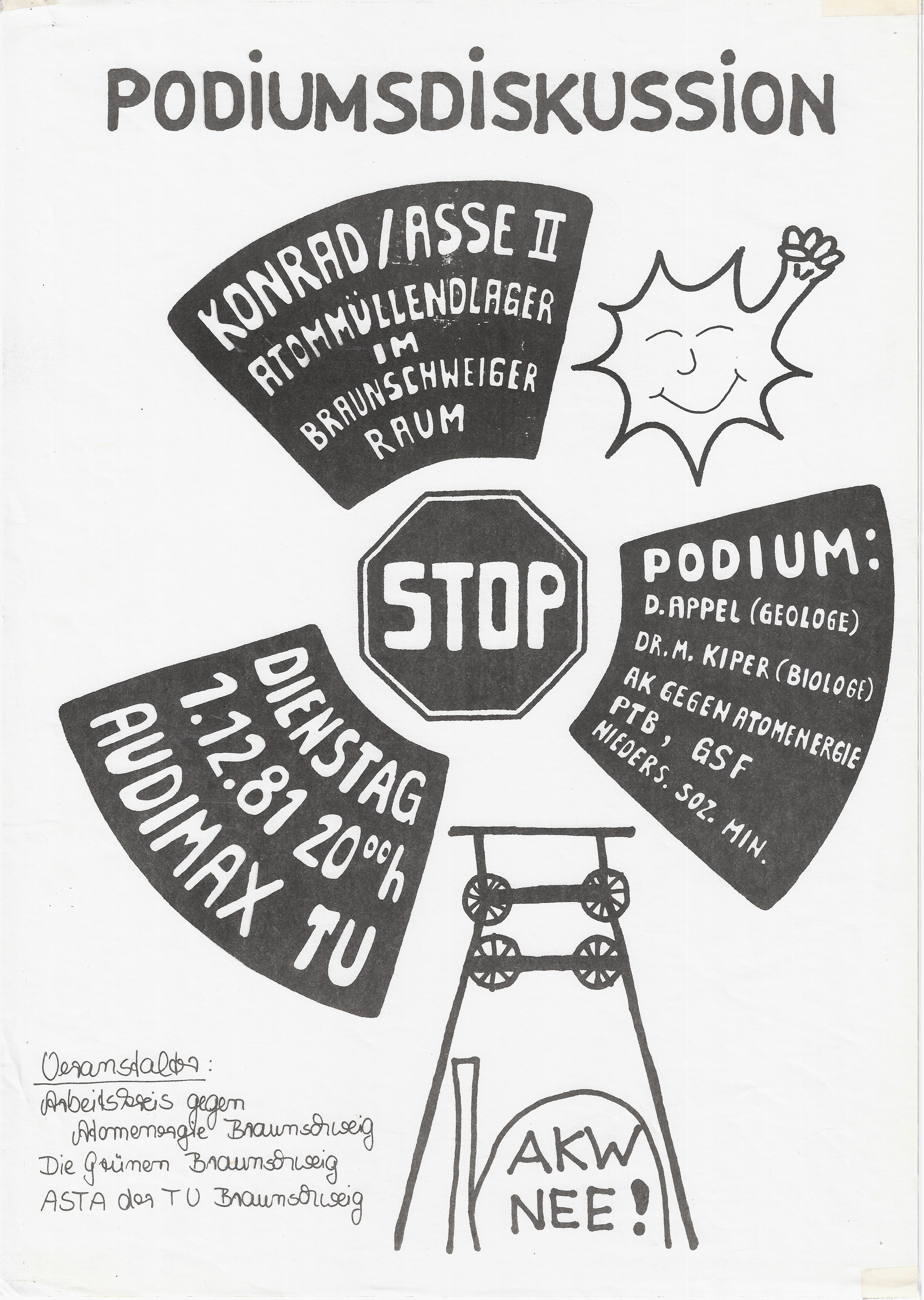 Titel/Autor: Podiumsdiskussion : KONRAD/ASSE II, 1.12.81, Braunschweig Laufzeit: 1981 Umfang: 1 Plakat DIN A3 Signatur: S-2-7