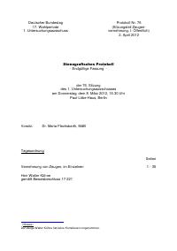 enthält: Deutscher Bundestag, 17. Wahlperiode, 1. Untersuchungsausschuss : Stenografische Protokolle: -Protokoll Nr. 76 vom 2.4.2012: 76. Sitzung des 1. Untersuchungsausschusses am 8.3.2012, Sitzungsteil Zeugenvernehmung [Vernehmung Name1] (36 Seiten) -Protokoll Nr. 78 vom 2.4.2012: 78. Sitzung des 1. Untersuchungsausschusses am 29.3.2012, Sitzungsteil Zeugenvernehmung [Vernehmung Name2] (4 Seiten) -Protokoll Nr. 80 vom 12.6.2012: 80. Sitzung des 1. Untersuchungsausschusses am 26.4.2012, Sitzungsteil Zeugenvernehmung [keine Vernehmung wegen Beratungsitzung] (4 Seiten) -Protokoll Nr. 82 vom 12.6.2012: 82. Sitzung des 1. Untersuchungsausschusses am 10.5.2012, Sitzungsteil Zeugenvernehmung [Vernehmung Name3] (51 Seiten) -Protokoll Nr. 84 vom 20.6.2012: 84. Sitzung des 1. Untersuchungsausschusses am 24.5.2012, Sitzungsteil Zeugenvernehmung [Vernehmung Name4] (63 Seiten) -Protokoll Nr. 86 vom 13.8.2012: 86. Sitzung des 1. Untersuchungsausschusses am 14.6.2012, Sitzungsteil Zeugenvernehmung [Vernehmung Name5] (101 Seiten) -Protokoll Nr. 88 vom 24.8.2012: 88. Sitzung des 1. Untersuchungsausschusses am 28.6.2012, Sitzungsteil Zeugenvernehmung [Vernehmung Name6] (36 Seiten) -Protokoll Nr. 90 vom 2.10.2012: 90. Sitzung des 1. Untersuchungsausschusses am 13.9.2012, Sitzungsteil Zeugenvernehmung [Vernehmung Name7] (114 Seiten) -Protokoll Nr. 92 vom 30.10.2012: 92. Sitzung des 1. Untersuchungsausschusses am 27.9.2012, Sitzungsteil Zeugenvernehmung [Vernehmung Name8] (76 Seiten) [Bericht des Untersuchungsausschusses, der auf die Protokolle Bezug nimmt, siehe unter P-US1-5-20-50-96]