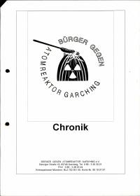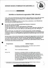 enthält: - Infomappe: -Informationsdienst: Kuckucksei : Forum der Bürger gegen Atomreaktor Garching e.V. (BGAG), Ausgabe 3, November 1993 (Digitalisat vorhanden) -Beitrittserklärung und Überweisungsschein -Werbe-Flugblatt: Reaktoren NEIN!, Verkauf einer Musik-Nachrichten-Kassette mit 2x 10 Minuten Musik zum Nachfühlen und Atom-Nachrichten aus aller Welt zum Nachdenken / Bürger gegen Atomreaktor Garching e.V. (siehe S-7-35-4) -Einwendungen gegen den geplanten neuen Atomforschungsreaktor FRM II in Garching / Bürger gegen Atomreaktor Garching e.V. -Leitfaden für Einwender/innen : Atomforschungsreaktor München II (FRM II) / Bürger gegen Atomreaktor Garching e.V., 20.10.1993 -Presseerklärung IIPNW, Regionalgruppe Starnberg, 30.11.1993 -Resolution zum Bau des Forschungsreaktors München II in Garching / Studentische Vollversammlung der Technischen Universität München (TUM), 7.12.1993 -Informationen zum geplanten Forschungsreaktor FRM II in Garching / Umweltinstitut München e.V., 2.12.1993 -Expertenverzeichnis und Anhörung: Expertenanhörung der Ausschüsse für kulturpolitische Fragen, Landesentwicklung und Umweltfragen, Wirtschaft und Verkehr sowie Staatshaushalt und Finanzfragen zum Thema: Erneuerung der Hochflußneutronenquelle der Technischen Universität München in Garching / Bayerischer Landtag, 29.4.1993 -Presseartikel: Uran höchster Dichte : Pläne für Münchner Forschungsreaktor unterlaufen internationale Anstrengungen gegen Weiterverbreitung von Atomwaffen / Gerd Rosenkranz, in: Süddeutsche Zeitung (SZ) vom 11.11.1993 -Flugblätter: Bund Naturschutz in Bayern e.V., Landesverband für Umweltschutz, Kreisgruppe München (Hochangereichertes, waffenfähiges Uran im FRM-II?, 9.11.1993 sowie Ein neuer Atomreaktor nach Garching?, 23.3.1993) -Flugblatt: Mütter gegen Atomkraft e.V., Januar 1990 - Chronik: 21.10.1986 bis 13.6.1997 (78 Seiten) (Digitalisat vorhanden, vergleiche P-GG1) - Pressemitteilungen der Jahre 2000 bis 2003, 4.1.2000-1.7.2003