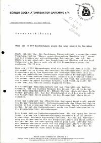 enthält: -Presseartikel, 18.7.1996 bis 28.11.1996: Bau FRM II und Proteste (Sonntagsspaziergang am Baugelände, Erster Spatenstich), Einstellung des Ermittlungsverfahrens gegen Reaktorbetreiber FRM I wegen Bodenverseuchung, Rückzug Klage gegen FRM-II-Pressesprecher, Klagen Stadt München und Gemeinde Eching gegen Erste Teilerrichtungsgenehmigung, Zwischenlager, Bundesverdienstkreuz für wissenschaftlichen Leiter des FRM II, Polizei-Anhörung Fischers, Gutachten Öko-Institut, Votum gegen HEU, Eröffnung Baustellengelände, Ablehnung Einladung zum Spatenstich durch Garchinger Pfarrer, Bürgerbegehren abgelehnt -Informationsdienste: Nachbarschafts-Zeitung : Forschung rund ums Atom-Ei, Ausgaben 4/96 und 5/96, Garching Aktuell : Monatliche Sonderausgabe des Stadtspiegel, Ausgabe 4/96 -Presseinformationen bzw. Pressemitteilungen: Bündnis gegen Atomreaktor Garching (1.8.1996-21.11.1996), Technische Universität München - Projektgruppe Neuer Forschungsreaktor (2.8.1996-20.11.1996), Umweltinstitut München e.V. (7.10.1996), Bündnis 90/Die Grünen im Bayer. Landtag (31.7.1996-10.10.1996) -Presseerklärung Bürger gegen Atomreaktor Garching: Kann man de Technischen Universität überhaupt noch etwas glauben? (13.11.1996) -Leserbriefe, u.a. Ingrid Wundrak, z.T. handschriftlich, 22.7.1996 bis 25.11.1996, enthält auch: -Schriftverkehr Bürger gegen Atomreaktor Garching e.V., 25.9.1996 bis 29.11.1996 -Schriftverkehr Ingrid Wundrak, 5.8.1996-[Anfang November 1996] -Email-Ausdrucke, 9.8.1996 -Flugblatt Bündnis gegen Atomreaktor Garching: Rechtsprechung stellt Fahrlässigkeitsbegriff auf den Kopf (25.11.1996) -Flugblätter zur Kundgebung auf dem Bürgerplatz Garching und anschließender Demonstration zum Bauplatz des FRM II am 24.11.[1996] -Einladung zur Pressekonferenz: "Weihnachtsboykott" gegen Siemens - Schluß mit der Atomtechnik! / Global 2000, BBU, Bündnis 90/Die Grünen Bayer. Landtag, Siemens-Boykott, 22.11.1996 -Protest-Unterschrift Ingrid Wundrak zum Siemens-Boykott, 8.11.1996 -Flugblatt: Kundeninformation Strahlenschutz (schlecht lesbare Kopie) -Flugblatt: Energiegeladene Rad-Tour durch Bayern, 2.-11.8.1996 / Jugendorganisation Bund Naturschutz -Redebeiträge beim alternativen Spatenstich in Garching, 1.8.1996: Dr. Ludwig Trautmann-Popp, Irene Maria Sturm (MdL) -Flugblatt: Stoppt die Atommafia! FRM II - Nein! / Ökologische Linke München, 1.8.1996 -Flugblatt: JAN Resolution zum sofortigen Ausstieg aus der Atomenergie / Jugend Aktions Netzwerk Bayern, 26.4.1996 -offizielle Einladung zum 1. Spatenstich am Donnerstag, 1. August 1996, 11.00 Uhr auf der künftigen Baustelle "Neue Forschungs-Neutronenquelle Garching" (Faltblatt mit Einlage: Einladung durch Prof. Dr. Wolfgang A. Herrmann - Präsident der Technischen Universität München, Ablauf, Anfahrtsbeschreibung) -Flugblatt: Demonstration gegen den Baubeginn des FRM-II! / SMV-Buendnis, 1.8.1996 -Anschreiben Bund Naturschutz in Bayern e.V. an TU München, Projektgruppe Neuer Forschungsreaktor FRM-II vom 23.5.1996 (Fax vom Juli 1996): [Beschwerde und Kritik]