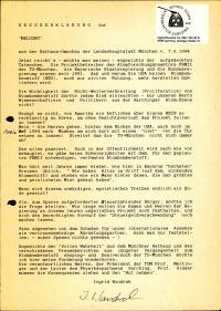 enthält: -Presseartikel, 4.1.1994-14.4.1994: Stoiber in Garching, Besuch Gröbl, Grundsteinlegung, "Mütter gegen Atomkraft", Spallationsquelle, waffenfähiges Uran, Atommüll, Strahlung, Niedrigstrahlung, Einwände USA, hochangereichertes Uran, AKW-Bau in Bayern, Hauptversammlung Siemens, Siemens-Boykott, Augenkrebs in Sellafield, Deutsch-Russische Partnerschaft, Tschernobyl, Säuglingssterblichkeit, Gutachten Öko-Institut, gefälschter Fragebogen zum Katastrophenschutz, Sicherheitsbedenken, Einwendungen, ALMR und MHTGR, Bürgerentscheid, Hauptversammlung Bund Naturschutz, Sicherheitsbericht, Stilllegung Atom-Ei, Häufung von Missbildungen in England, Werbung, Proteste, Strahlenbelastung, Atomwaffen, Flugzeugabsturz, Leck im Forschungsreaktor Norwegen, Studenten-Kritik, Plakatieren verboten -Pressemitteilungen, 16.1.1994-17.3.1994: Bürger gegen Atomreaktor Garching e.V., Bund Naturschutz in Bayern e.V. -Artikel: Rückblick auf fünf Jahrzehnte : Interview mit H. Maier-Leibnitz / H. Rechenberg, S. Ulbig, in: Phys. Bl. 50 (1994) Nr. 3 -Artikel: Kommen Sie zur Erörterung! : Zweite Runde im atomrechtlichen Genehmigungsverfahren zum FRM II / Christina Hacker, in: Umweltnachrichten, Ausgabe 55/94, Umweltinstitut München e.V. -Informationsdienst: Nachbarschaftszeitung : Forschung rund ums Atom-Ei / TU München, Ausgabe 1/94 -Leserbriefe, u.a. von Ingrid Wundrak -Schriftverkehr mit Presse -Telefaxe Ingrid Wundrak -Rundschreiben Physik-Department E13, TU München an Kolleg:innen vom 24.1.1994: Unterschriften für Werbeaktion in der Süddeutschen Zeitung, mit Anzeigentext sowie Formular für Unterschriften und Spendenbeiträge enthält auch: -Schriftverkehr: TU München und Ingrid Wundrak, 22.2.1994.-28.3.1994 -Schriftverkehr Studentische Vertretung der TU München, 25.1.1994-2.2.1994 -Flugblätter, u.a.: Der FRM II und die Interessenverflechtung von Industrie und Staat / Autonome Zelle "Erich Mühsam"