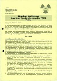 Schlagworte: Aktenmaterial, Einwendungen, Flugschriften, Flugzeugabsturz, Forschungsreaktor, FRM I, FRM II, Garching, Genehmigungsverfahren, Gesundheitsgefährdung, HEU, Informationsdienst, Kommune, München, Neutronen, Sicherheit, Stilllegung, Uran, Widerstand
