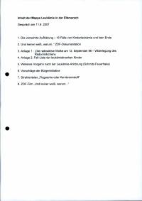 enthält u.a.: -Anhörung des Ausschusses für Soziales, Frauen, Familie und Gesundheit am 11./12. April 2007 zu "Leukämiefälle in der Elbmarsch müssen geklärt werden - Bürgerinnen und Bürger in der Elbmarsch nicht allein lassen" : Beantwortung der Fragen des Ausschusses zum Themenblock III "Kügelchen", 3.4.2004 [muss 2007 heißen?] (7 Seiten) -Bericht über die Sonderuntersuchung der Belastung des Bodens der Elbmarsch mit Alphastrahlern (Zusammenfassung) / Niedersächsisches Landesamt für Ökologie, 13.2.2001 (2 Seiten) -Bericht über die Sonderuntersuchung der Belastung des Bodens der Elbmarsch mit Alphastrahlern / Niedersächsisches Landesamt für Ökologie, [ohne Datum] (54 Seiten) -Nachtrag Landtagsanhörung: ergänzendes Material nach der Ausschuss-Sitzung vom 5.7.2006 -Wortprotokoll: Ausschuss-Sitzung Ausschuss für Soziales, Frauen, Familie und Gesundheit am 5.7.2006 (Entwurf) -Schriftverkehr BI -Projektskitze [sic!] Kolloquium Leukämie in der Elbmarsch / [Quelle?], [ohne Datum] (3 Seiten) -Presseerklärung Niedersächsisches Ministerium für Soziales, Frauen, Familie und Gesundheit, 10.12.2004 -Niedersächsischer Landtag: Wortprotokoll Plenarsitzung, 18.5.2006 (Auszug unkorrigiertes Manuskript, Beitrag Uwe Harden)