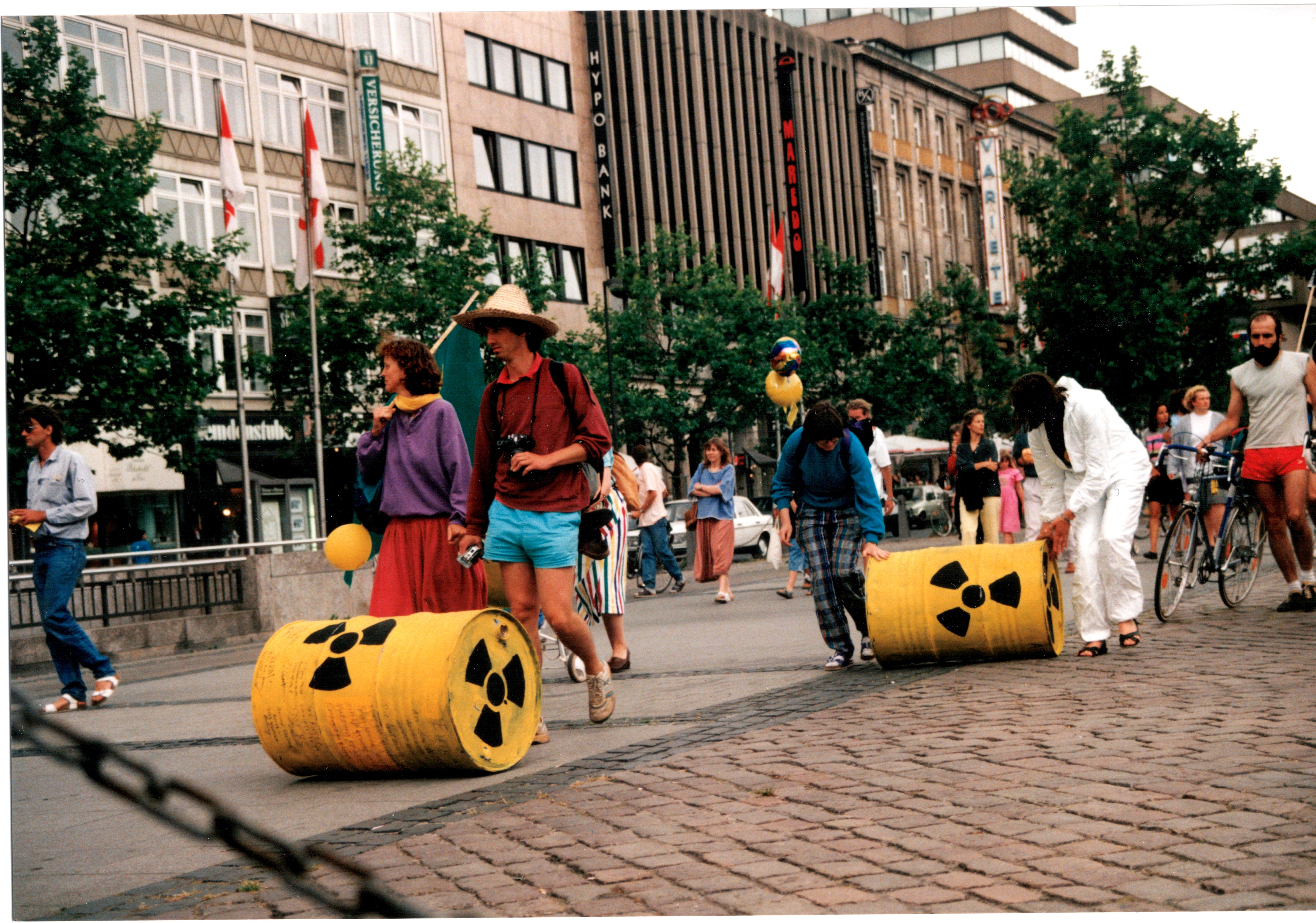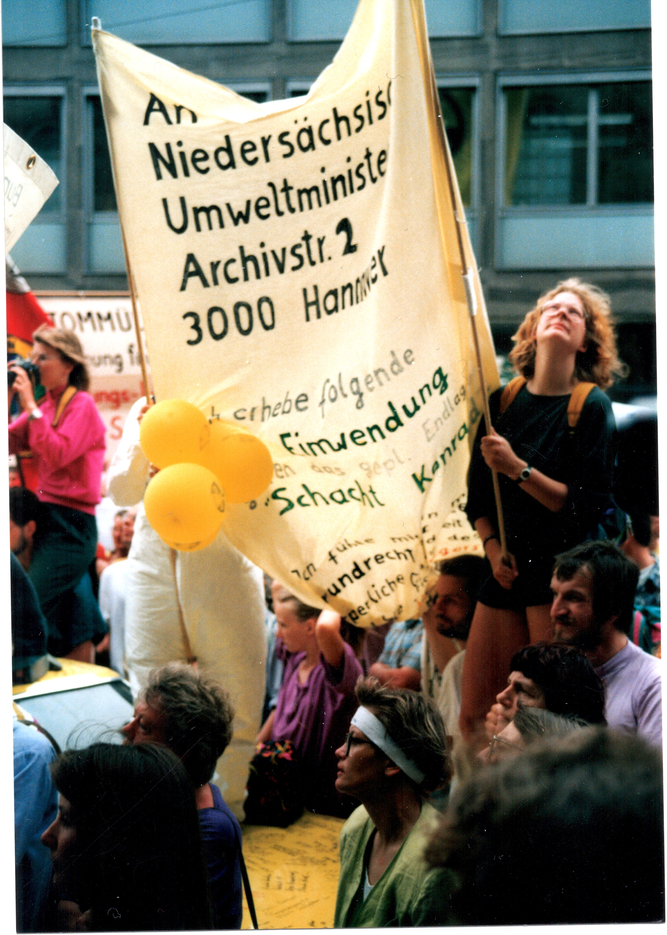 Signatur: S-1-11-13 Titel/Autor: Einwendungslawine und Übergabe der Einwendungen an Ministerin Griefahn : Demonstranten in Hannover, 13.07.1991 Laufzeit: 1991-07-13 Umfang: Papierabzug, 12,6x18,8 cm, farbig