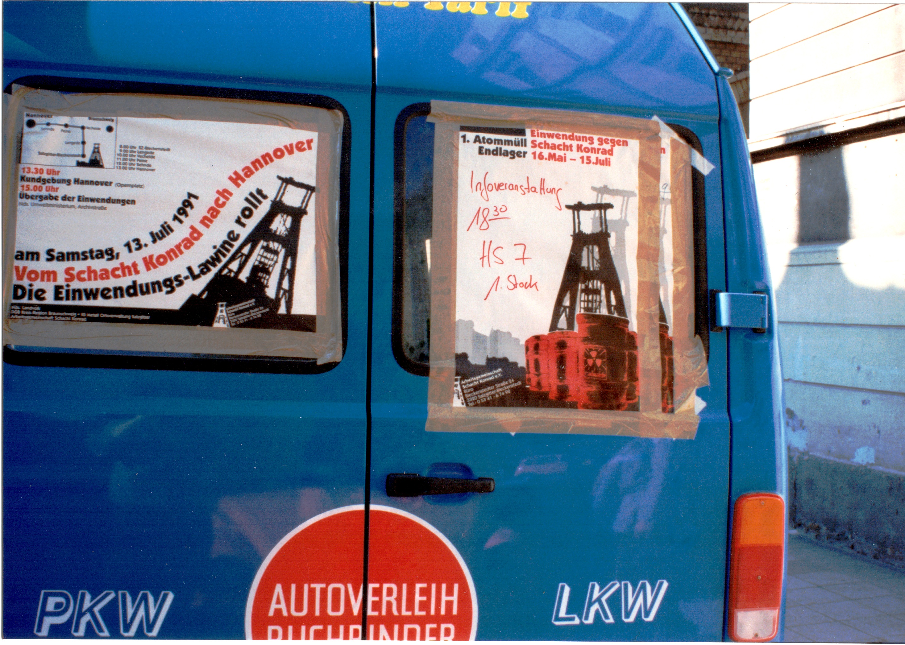 Signatur: S-1-9-22 Titel/Autor: Einwendungskampagne : Blauer Infobus Laufzeit: 1991-05-18 — 1991-07-06 Umfang: Papierabzug, 8,8x12,6 cm, farbig Rückseite des Infobusses Nr. 2 mit Plakaten