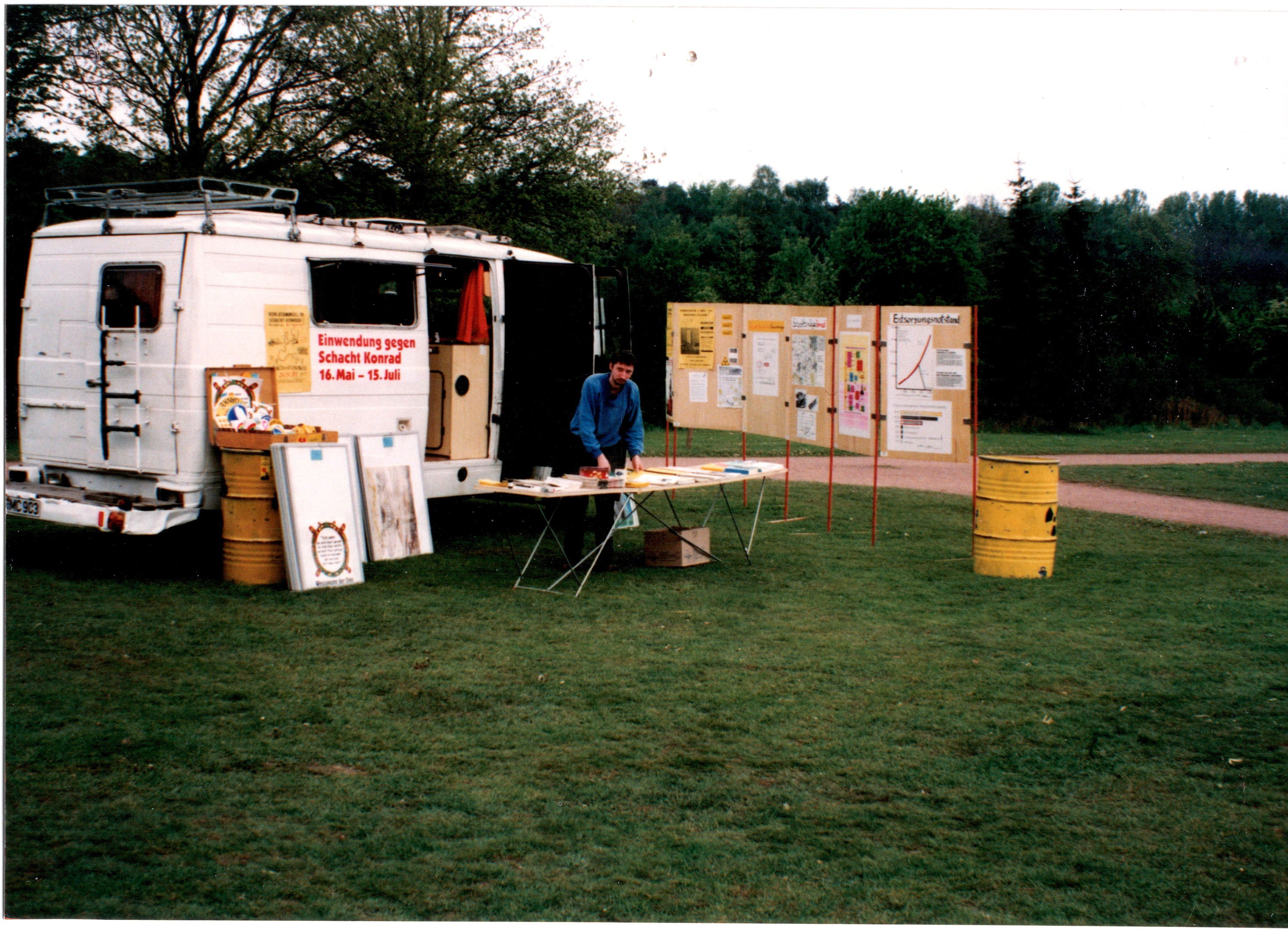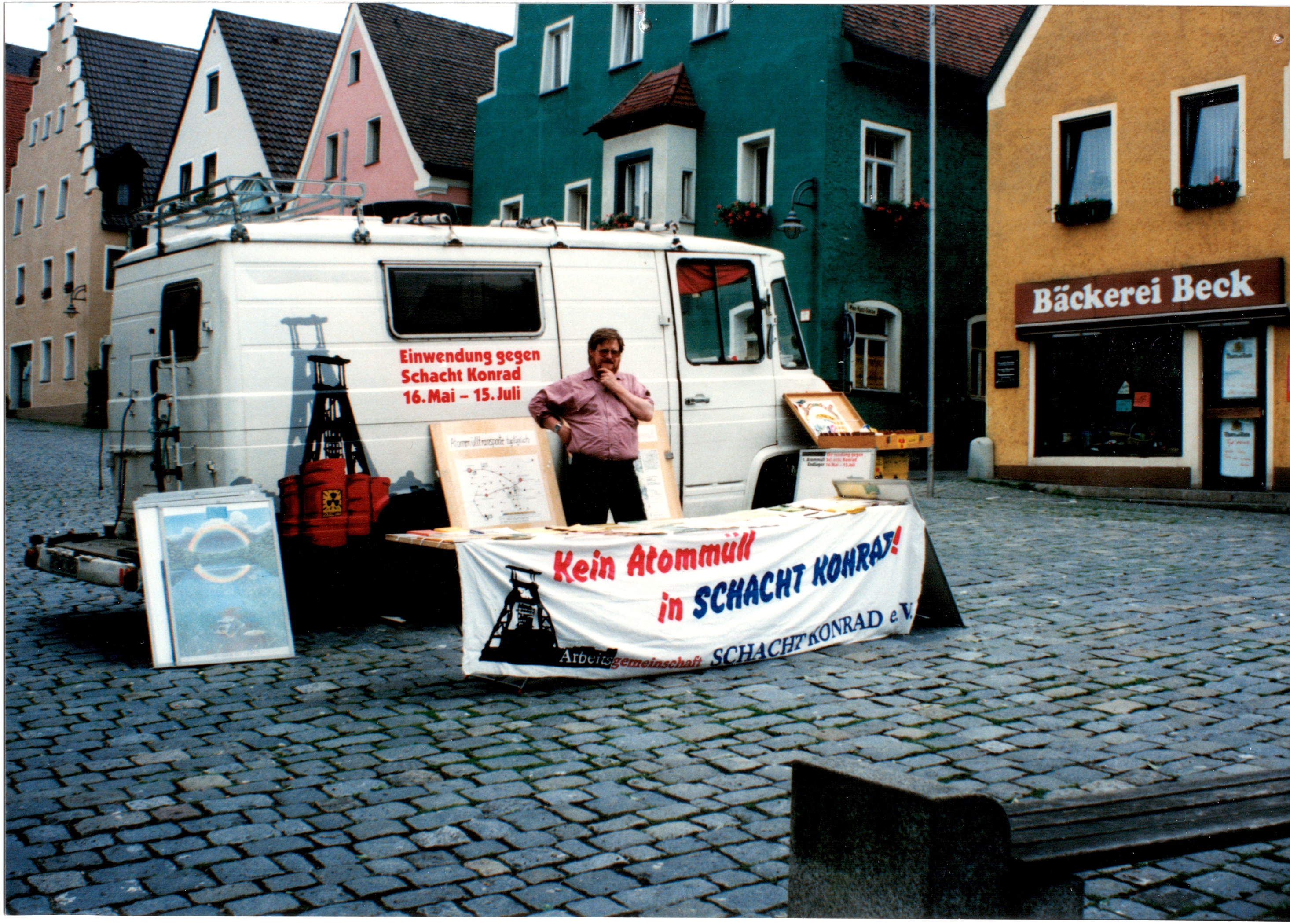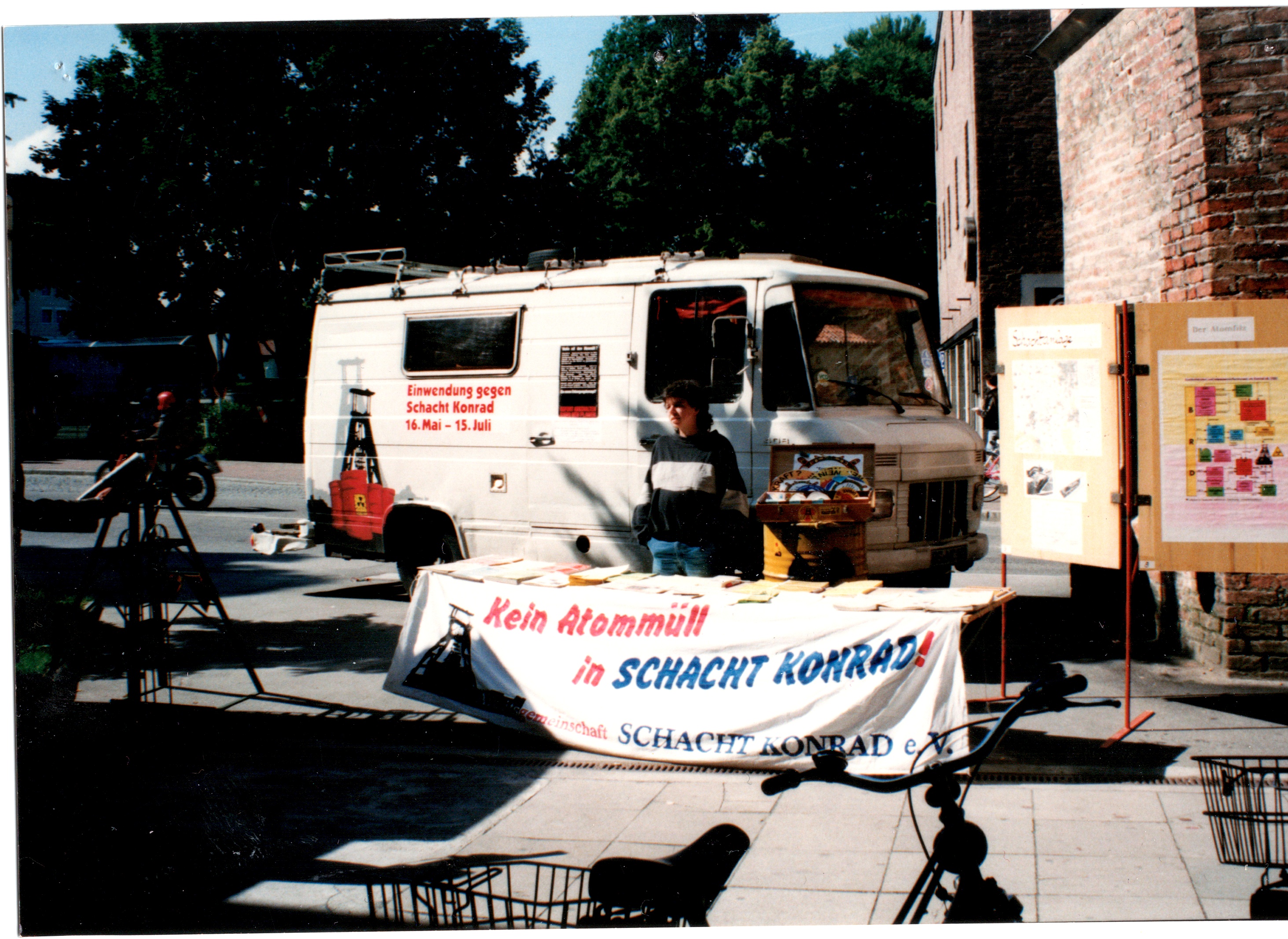 Signatur: S-1-9-26 Titel/Autor: Einwendungskampagne : Infobus in Weiden, 22.06.1991 Laufzeit: 1991-06-22 Umfang: Papierabzug, 8,8x12,6 cm, farbig