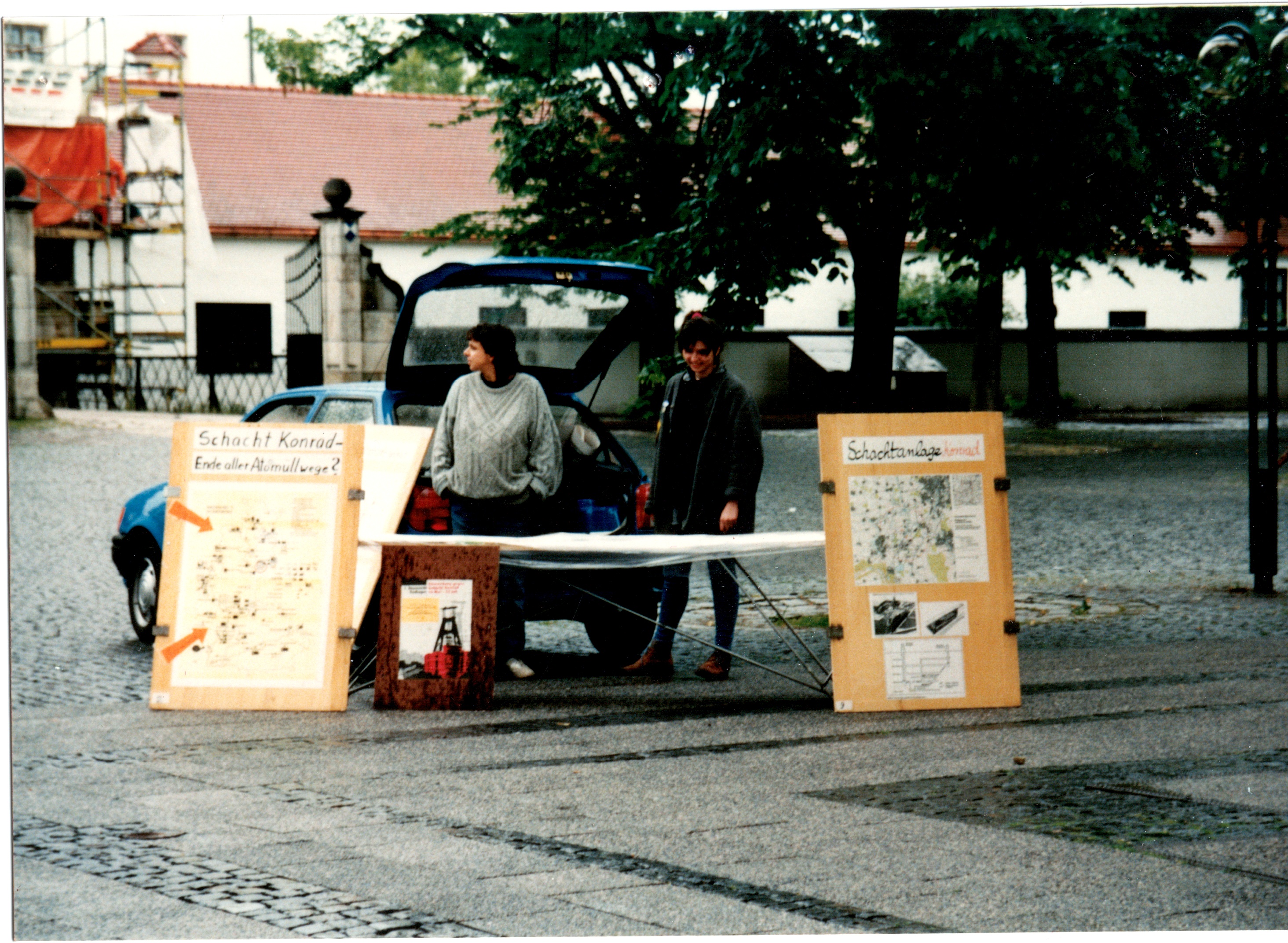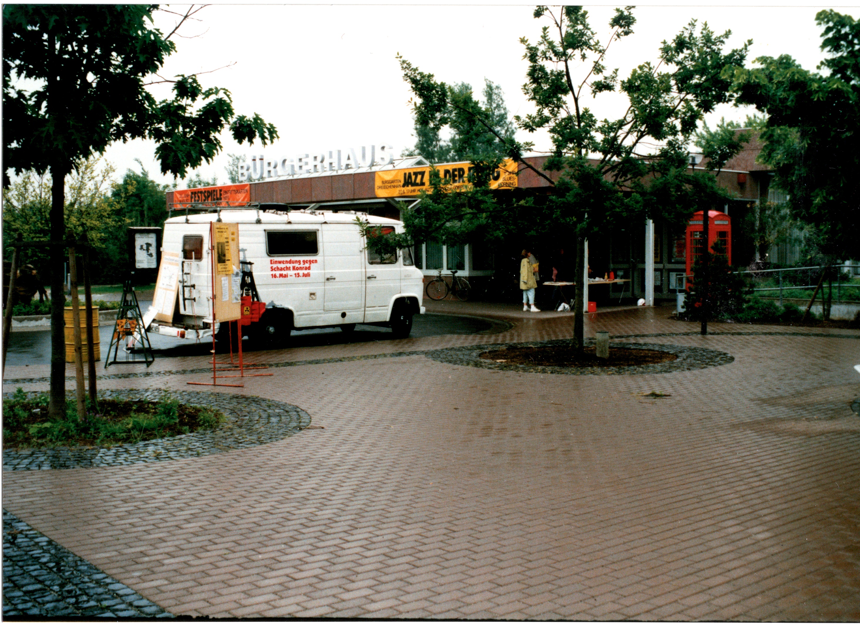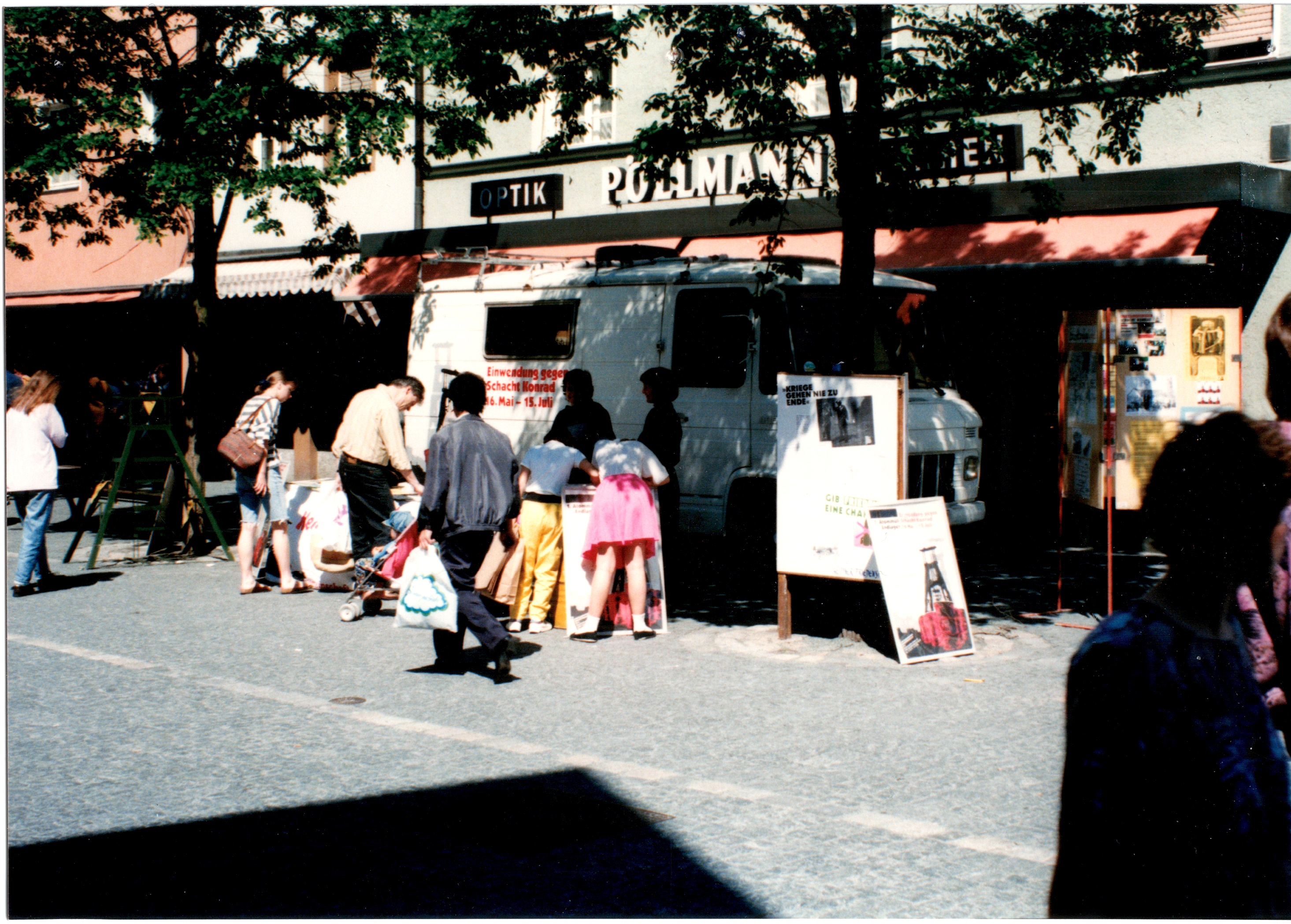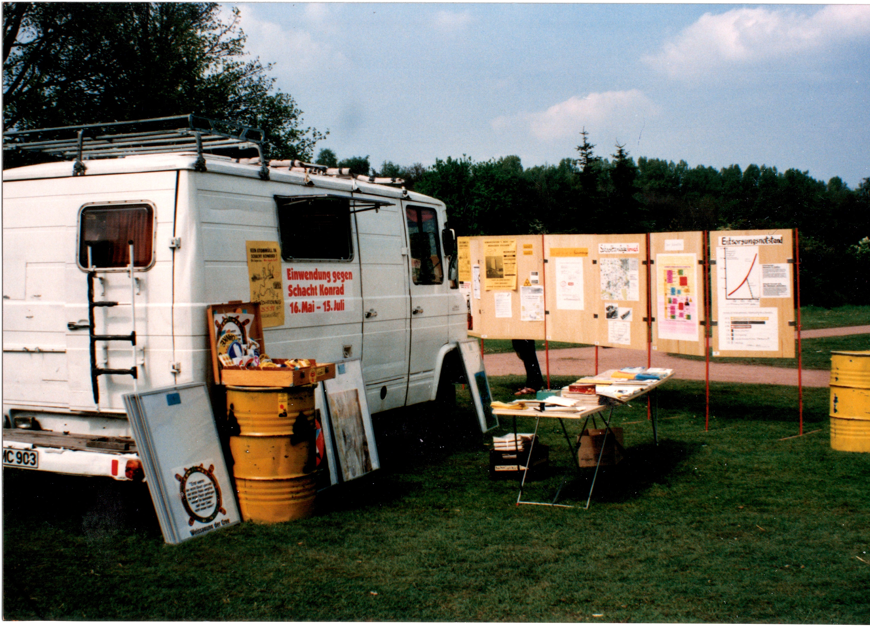 Signatur: S-1-9-26 Titel/Autor: Einwendungskampagne : Infobus in Weiden, 22.06.1991 Laufzeit: 1991-06-22 Umfang: Papierabzug, 8,8x12,6 cm, farbig