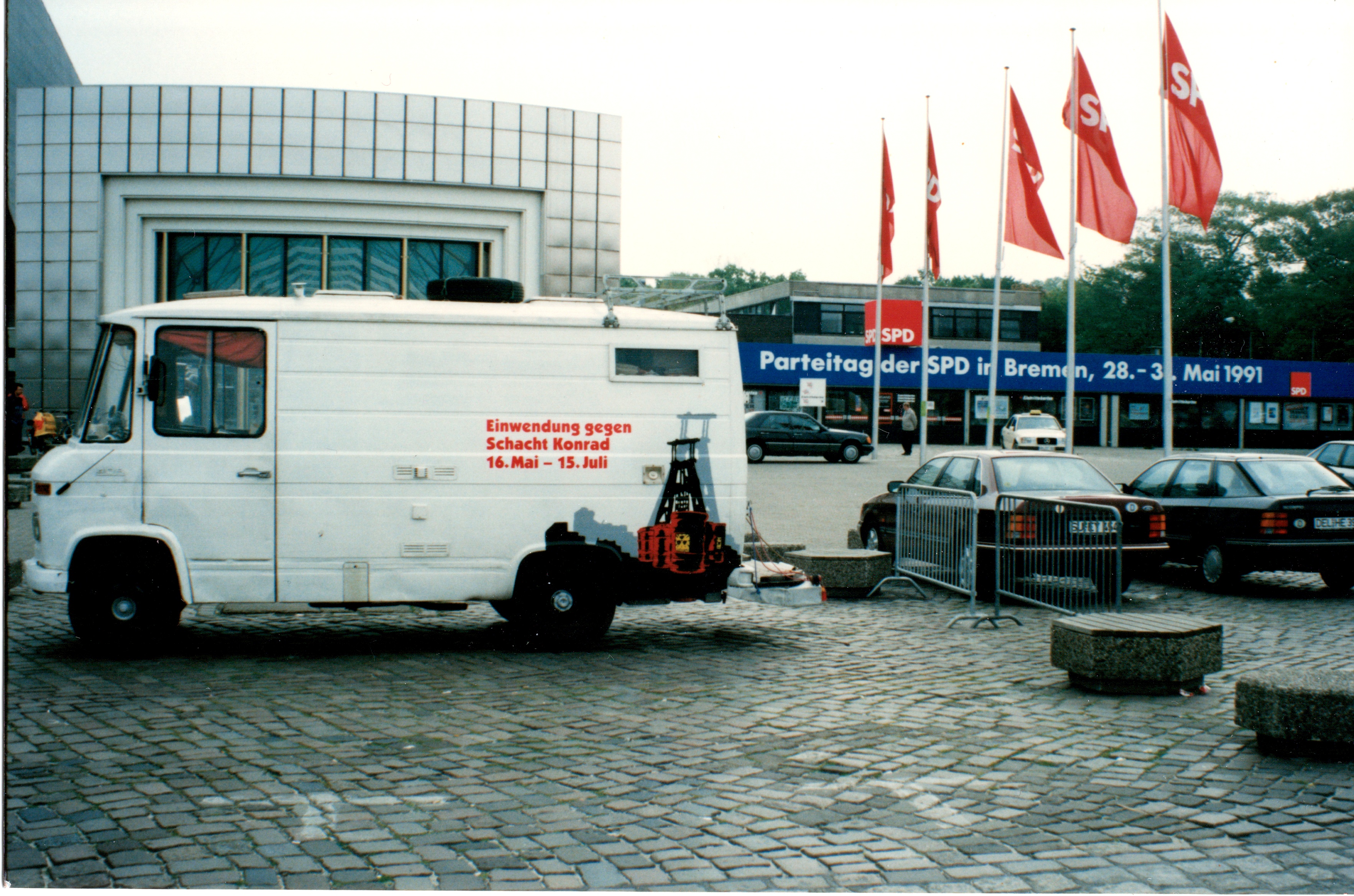 Signatur: S-1-9-21 Titel/Autor: Einwendungskampagne : Infobus in Bremen, 29./30.05.1991 Laufzeit: 1991-05-29 — 1991-05-30 Umfang: Papierabzug, 10x15 cm, farbig am Rande des SPD-Parteitages