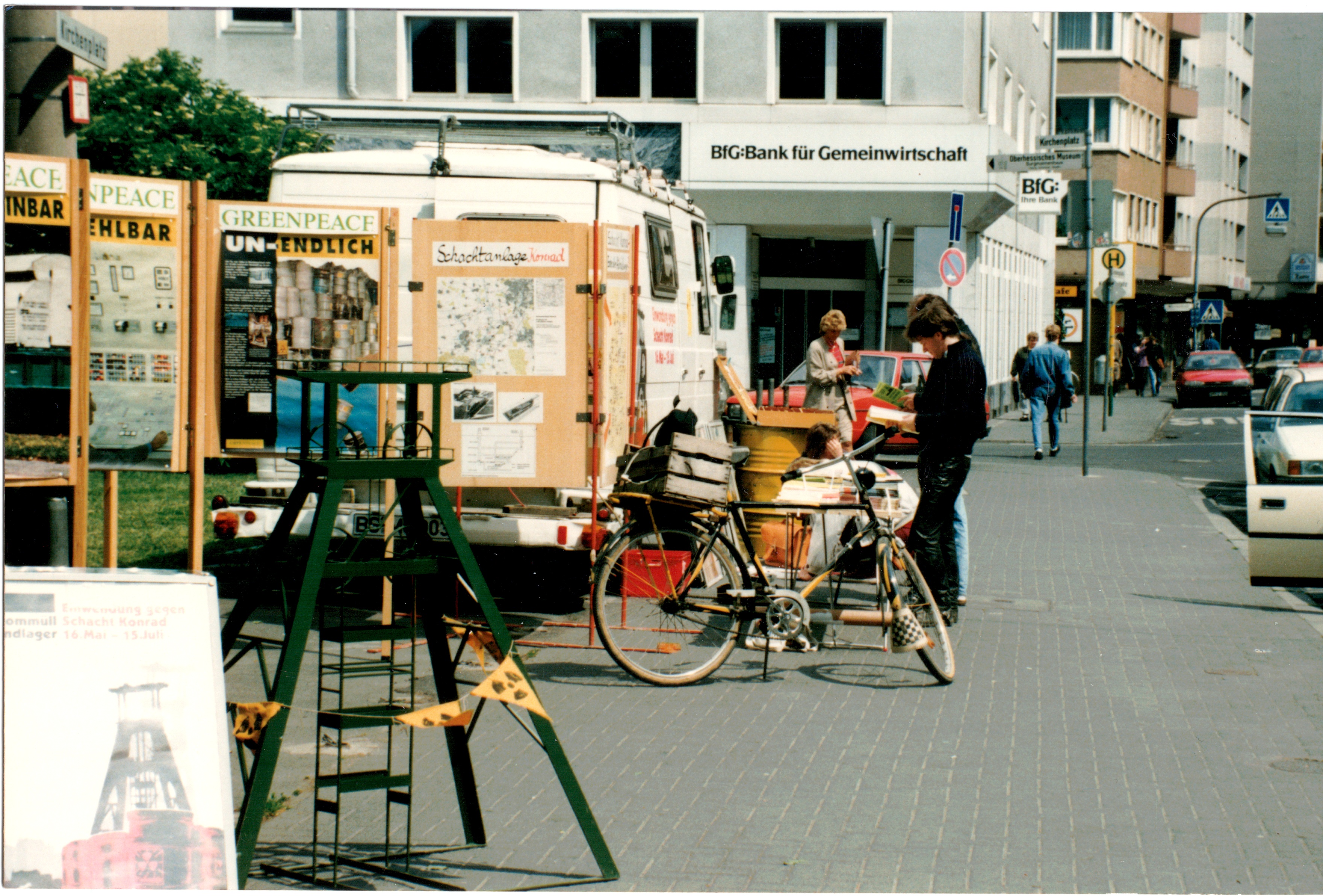 Signatur: S-1-9-3 Titel/Autor: Einwendungskampagne : Infobus in Goslar, 27.05.1991 Laufzeit: 1991-05-27 Umfang: Papierabzug, 8,8x12,6 cm, farbig