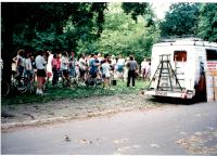 Signatur: S-1-9-5 Titel/Autor: Einwendungskampagne : Infobus in Grafenrheinfeld - Schweinfurt, 23.06.1991 Laufzeit: 1991-06-23 Umfang: Papierabzug, 8,8x12,6 cm, farbig am Rande der Fahrraddemonstration