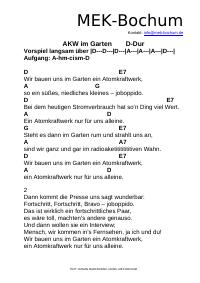 enthält: -Montags gegen die Atommafia (9 Strophen mit Refrain), Melodie: Laßt uns froh und munter sein -Bye bye Atomkonzerne (4 Strophen mit Refrain), Melodie: Bye, bye, Love